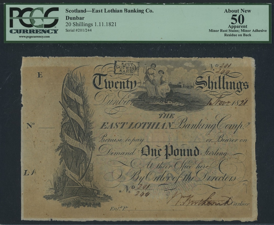 (x) East Lothian Banking Co., Scotland, 20/-, 1st November 1821, serial number 201/244, (PMS EA1b), in PCGS holder 50 About New, apparent minor rust stains, minor adhesive residue on back
