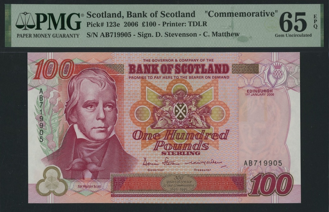 Bank of Scotland, Commemorative 100 Pounds, 1st January 2006, serial number AB719905, (Pick 123e), in PMG holder 65 EPQ Gem Uncirculated, only 10 notes in higher grade on PMG census