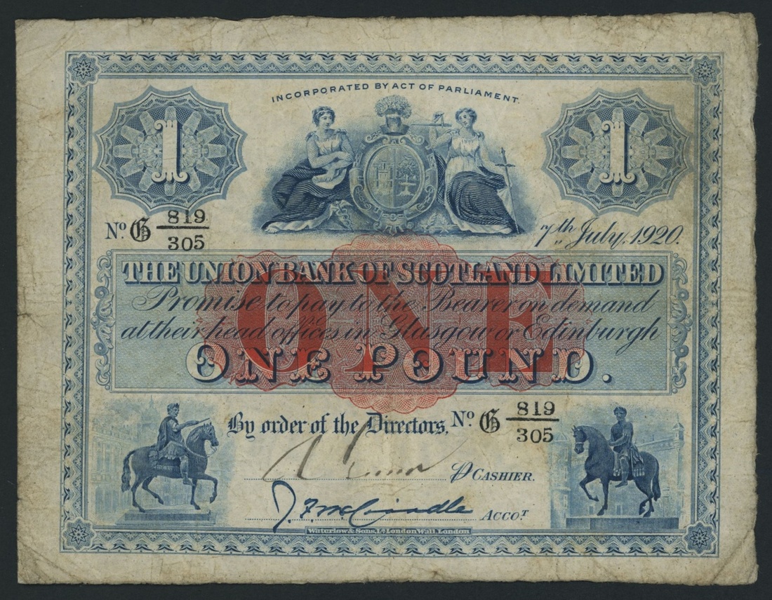 (x) Union Bank of Scotland Limited, £1, 7 July 1920, serial number G 819/305, sign. McCrindle, handsigned cashier signature,