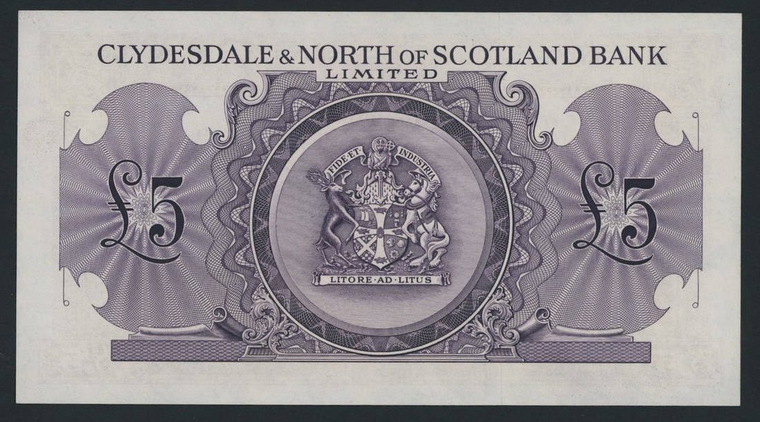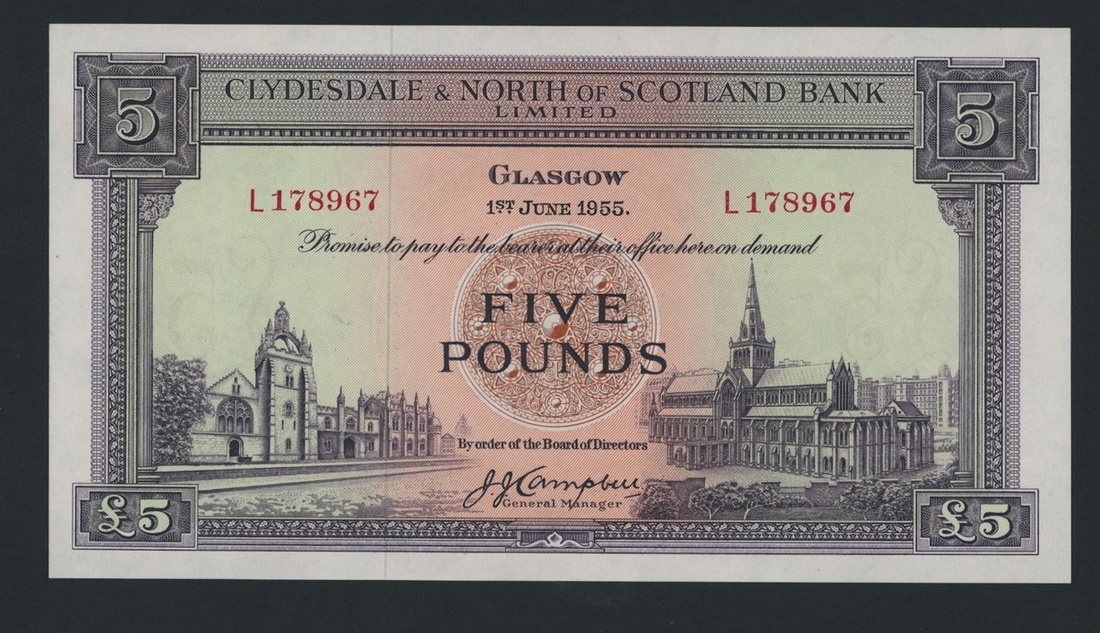 Clydesdale & North of Scotland Bank Limited, £5, Glasgow, 1st June 1955, serial number L178967, (PMS CL 25a), about uncirculated