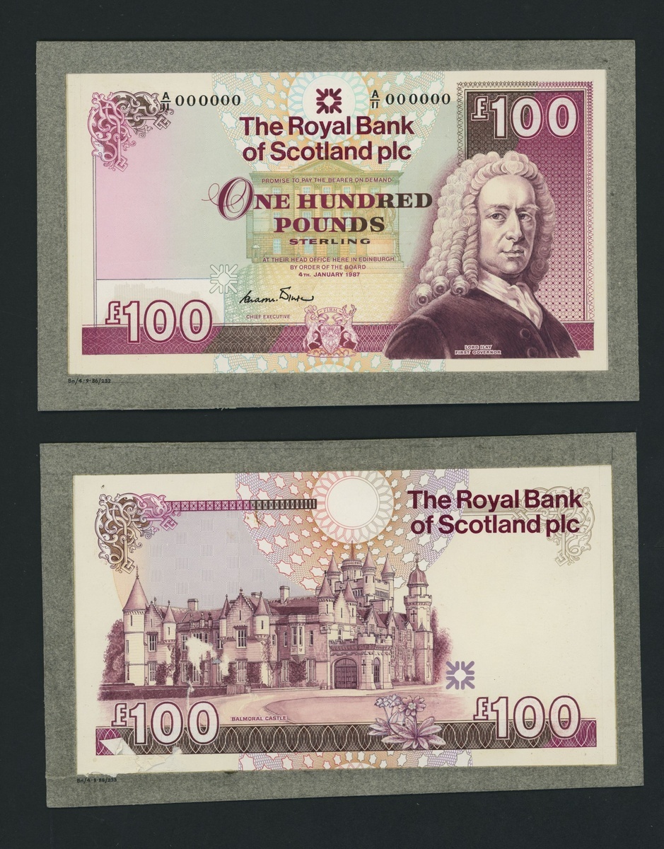 (x) The Royal Bank of Scotland plc, Scotland, Unissued pair of Front and Back essays on card for £100, 4th January 1987, serial number A/11 000000, (Pick 350p1, 350p2 date unlisted, BNB 488 for the type), mounted on cardboard