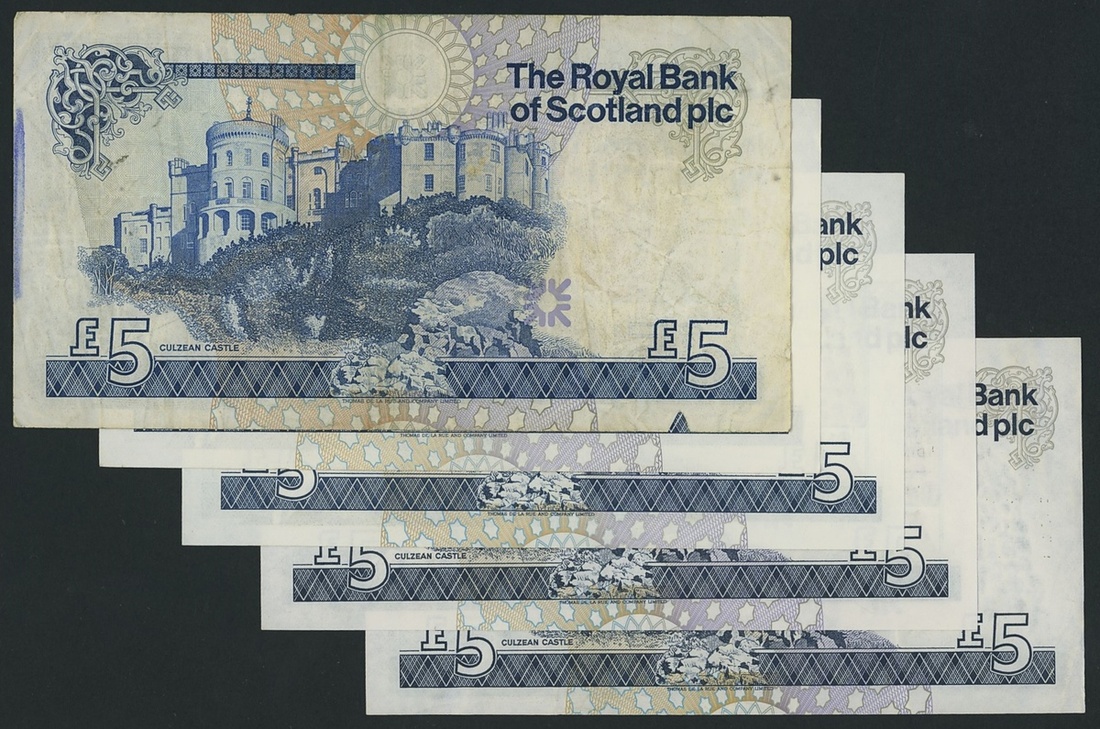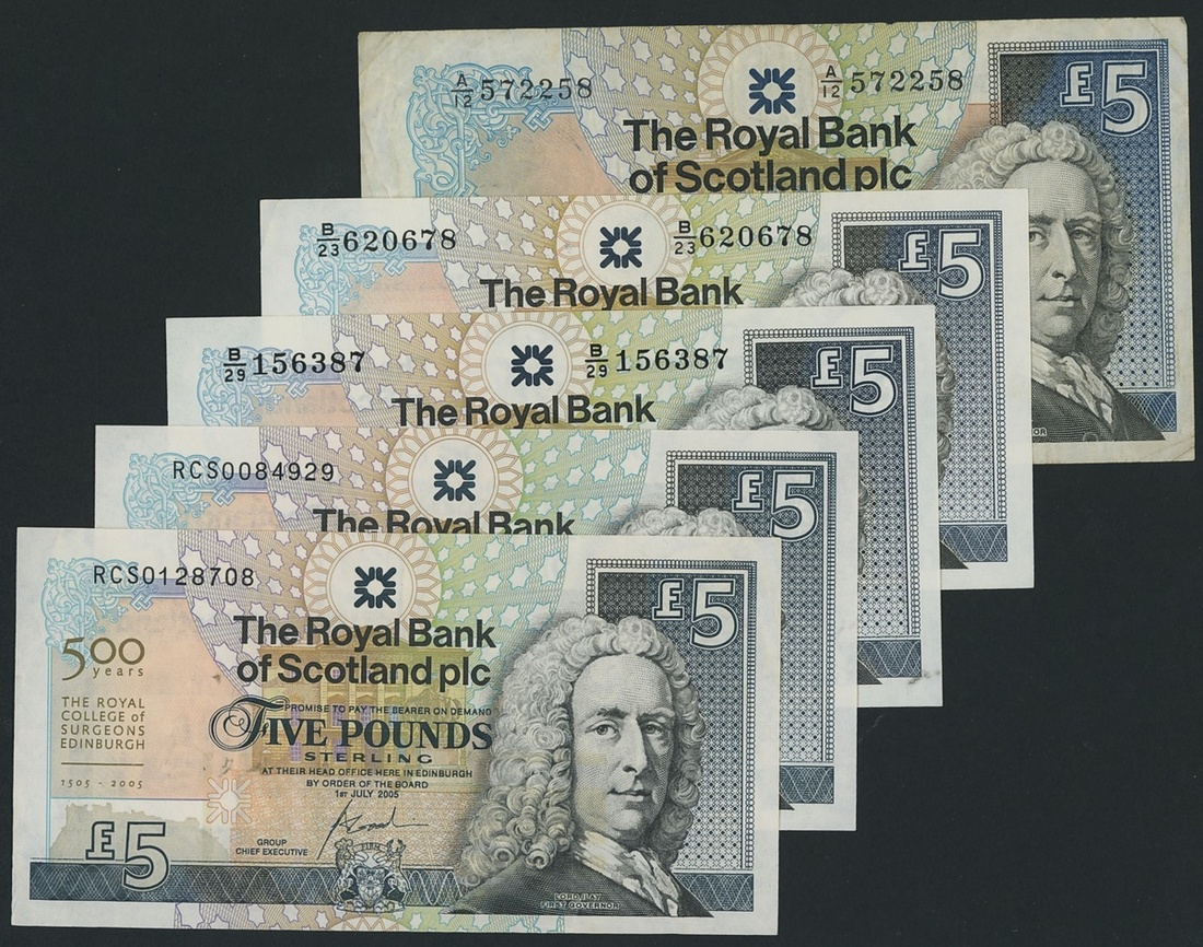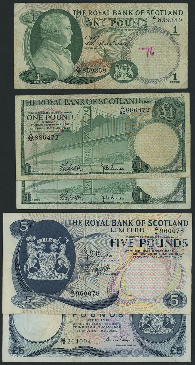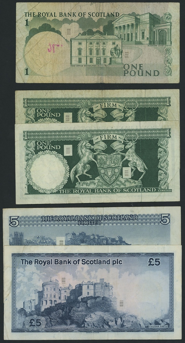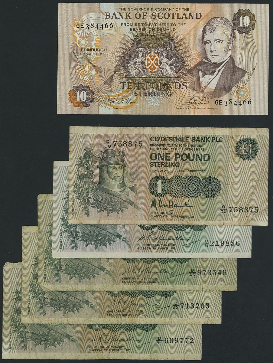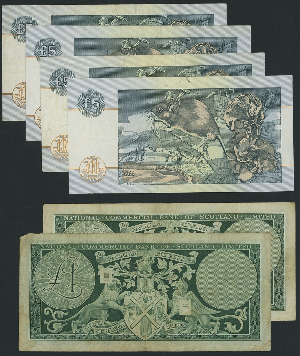 and a group of 11 notes from Clydesdale Bank and Commercial Bank (Pick 204, 218b, 269a, 271a), some Royal Bank of Scotland £5 notes (Pick 330, 342a, 347a, 352b, 364),