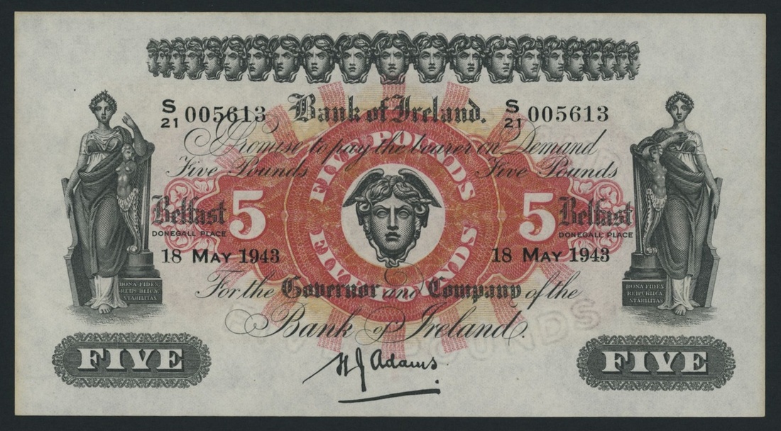 Bank of Ireland, Northern Ireland, £5, Belfast, 18th May 1943, serial number S/21 005613, (PMI BA 99), good extremely fine