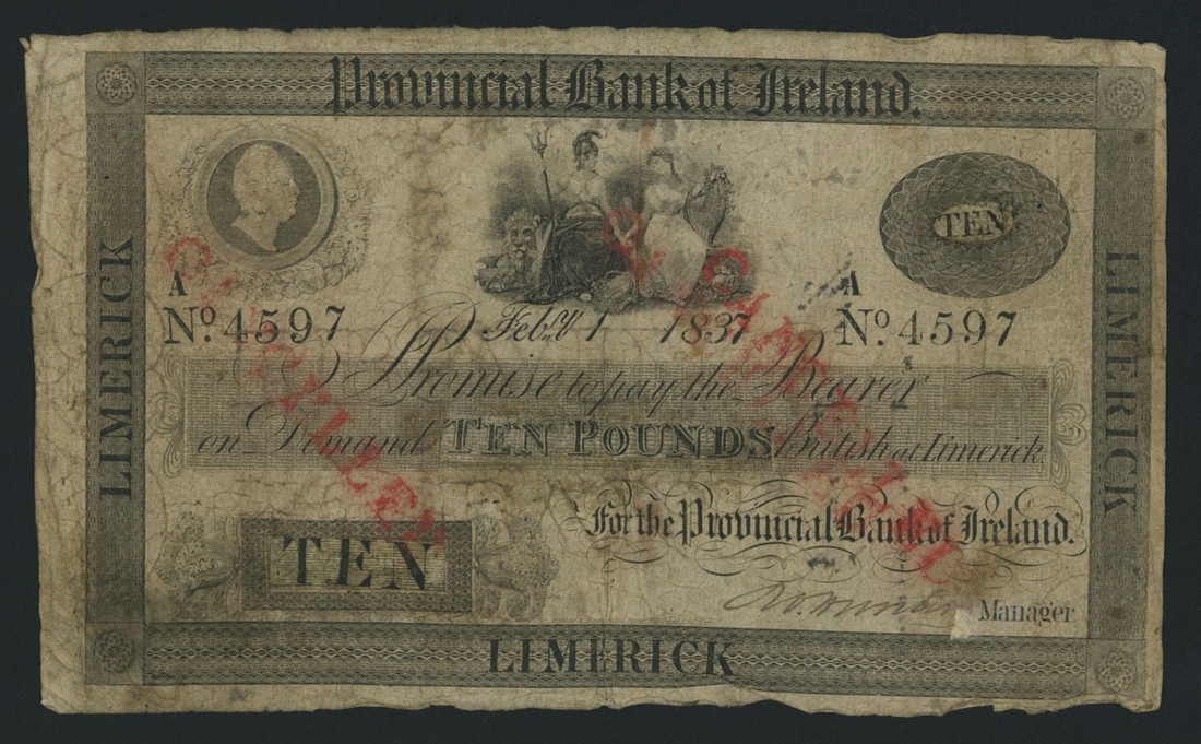 Provincial Bank of Ireland, [FORGERY] £10, Limerick, 1st February 1837, serial number A 4597, stamped 'CANCELLED', contemporary forgery,