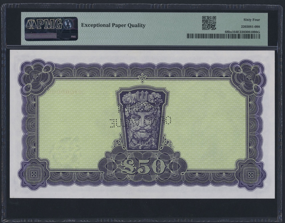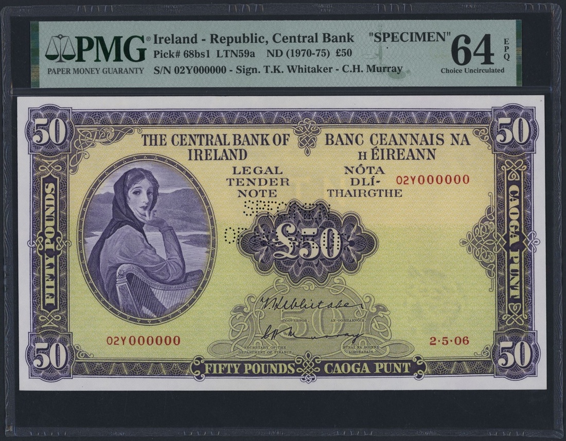 (x) The Central Bank of Ireland, Ireland - Republic, specimen £50, 2nd May 2006, serial number 02Y000000, Pick 68bs1, LTN59a, BNB 213 for type, date not listed), in PMG holder 64 EPQ Choice Uncirculated, only 8 notes in higher grade on PMG census