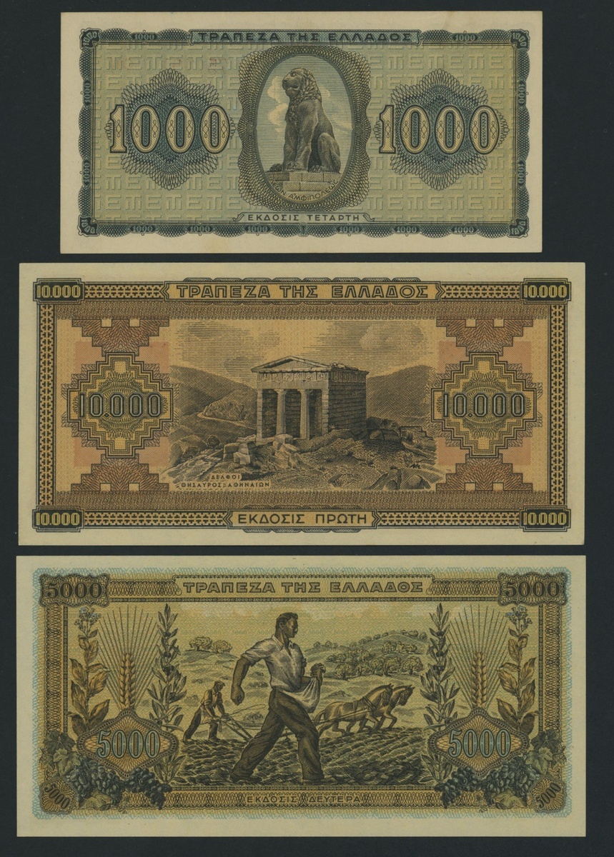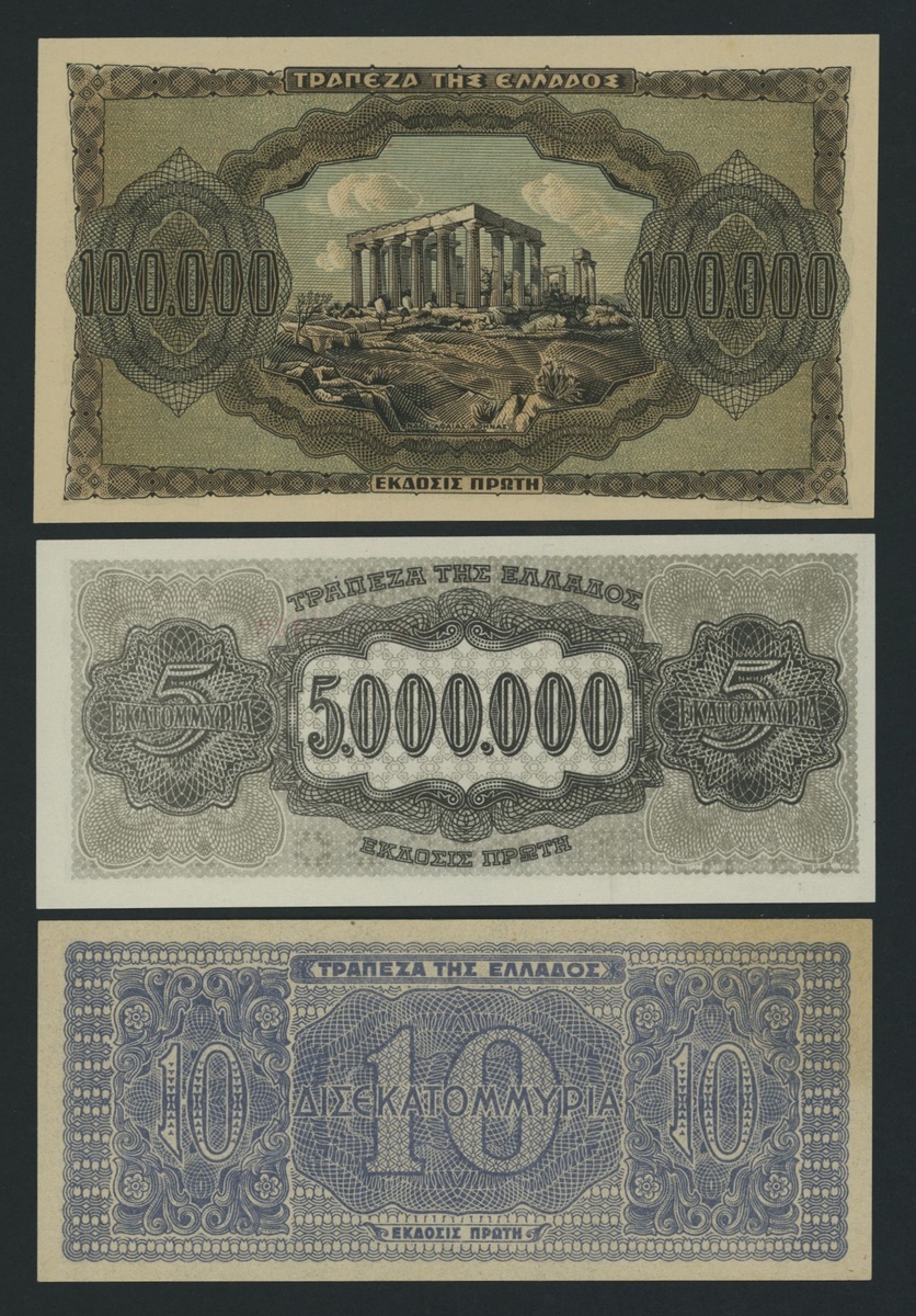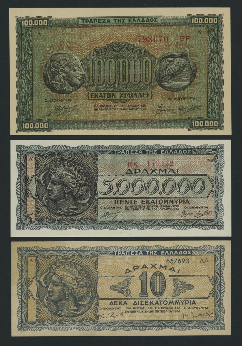 Bank of Greece, [6 notes] WWII inflation issues, 1942-44, (Pick 118, 119, 120, 125, 128, 134), about uncirculated to uncirculated