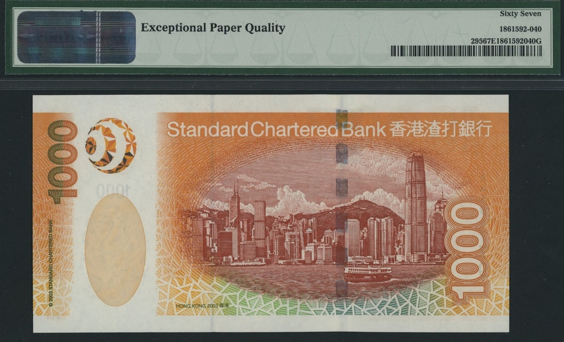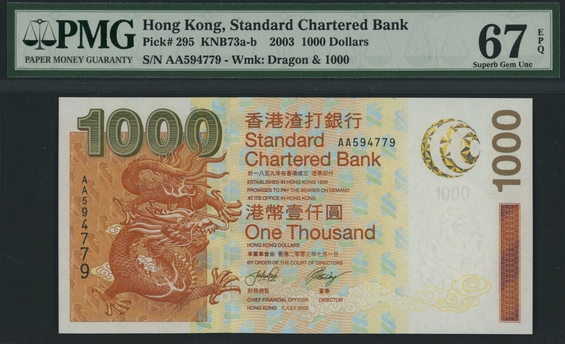 (x) Standard Chartered Bank, Hong Kong, 1000 Dollars, 1st July 2003, serial number AA594779, (Pick 295, BNB 417), in PMG holder 67 EPQ Superb Gem Uncirculated