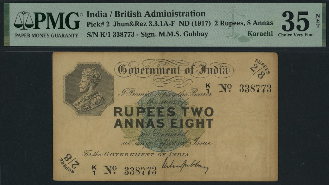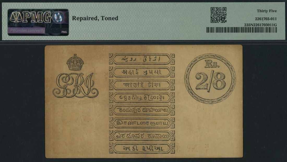 (x) Government of India, 2 Rupees 8 Annas, Karachi, ND (1917), serial number K/1 338773, (Pick 2, BNB 136), in PMG holder 35 NET Choice Very Fine, repaired, toned