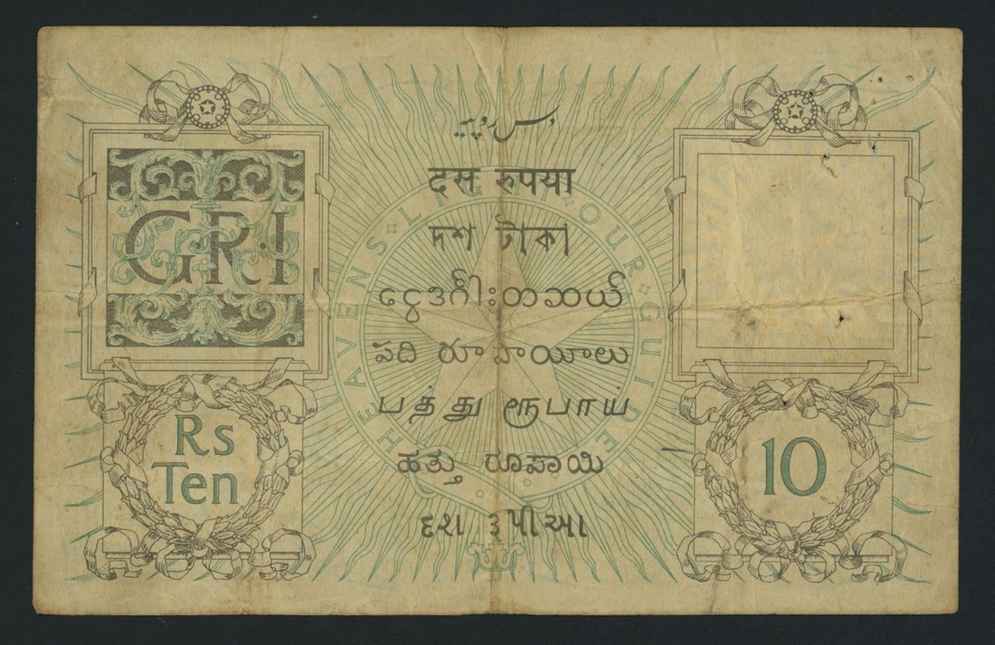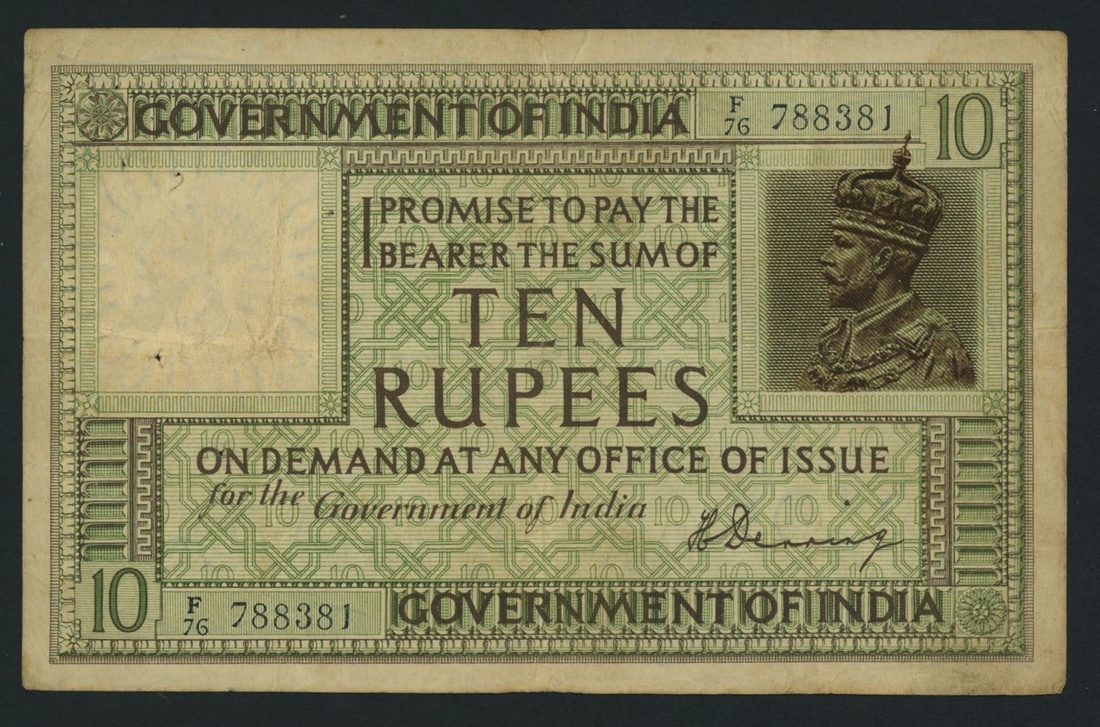 (x) Government of India, 10 Rupees, ND (1923), serial number F/76 788381, (Pick 5b, BNB 139b), very fine, pin holes, discolouration