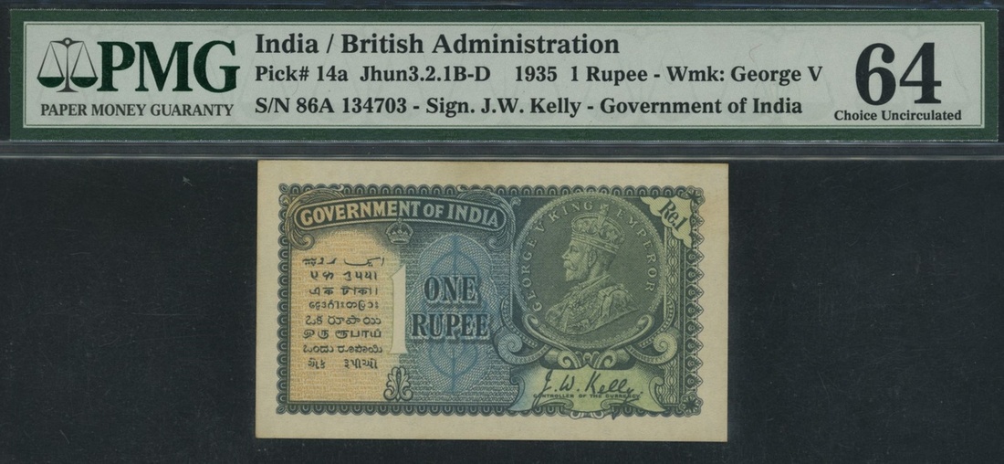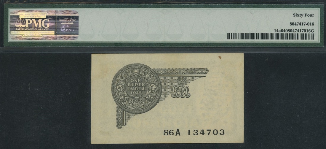 (x) Government of India, 1 Rupee, 1935, serial number 86A 134703, (Pick 14a, Jhun&Rez 3.2.1B-D, BNB 148), in PMG holder 64 Choice Uncirculated