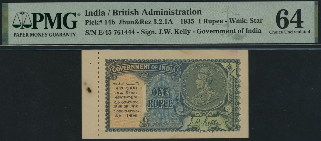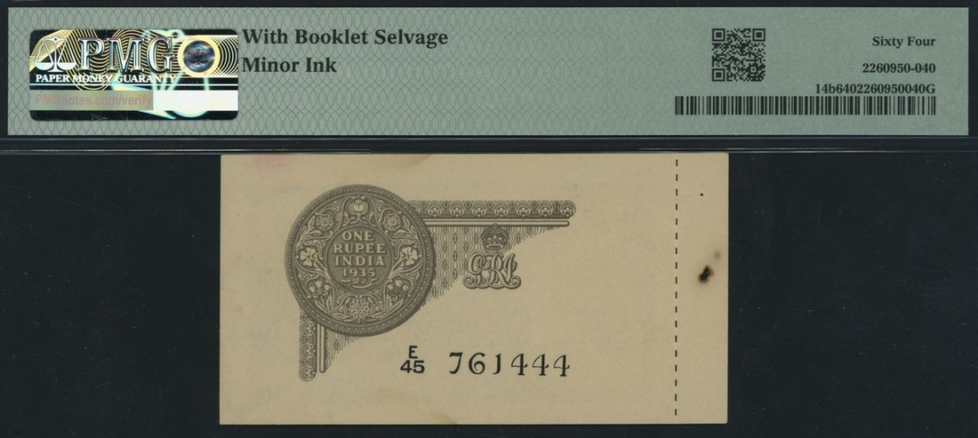 (x) Government of India, 1 Rupee, 1935, serial number E/45 761444, (Pick 14b, Jhun&Rez 3.2.1A, BNB 148), in PMG holder 64 Choice Uncirculated, with Booklet Selvage, minor ink