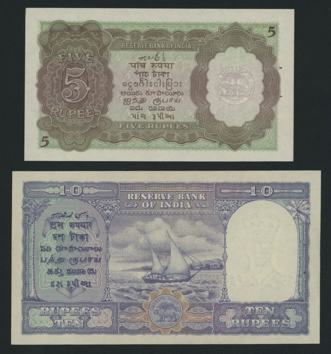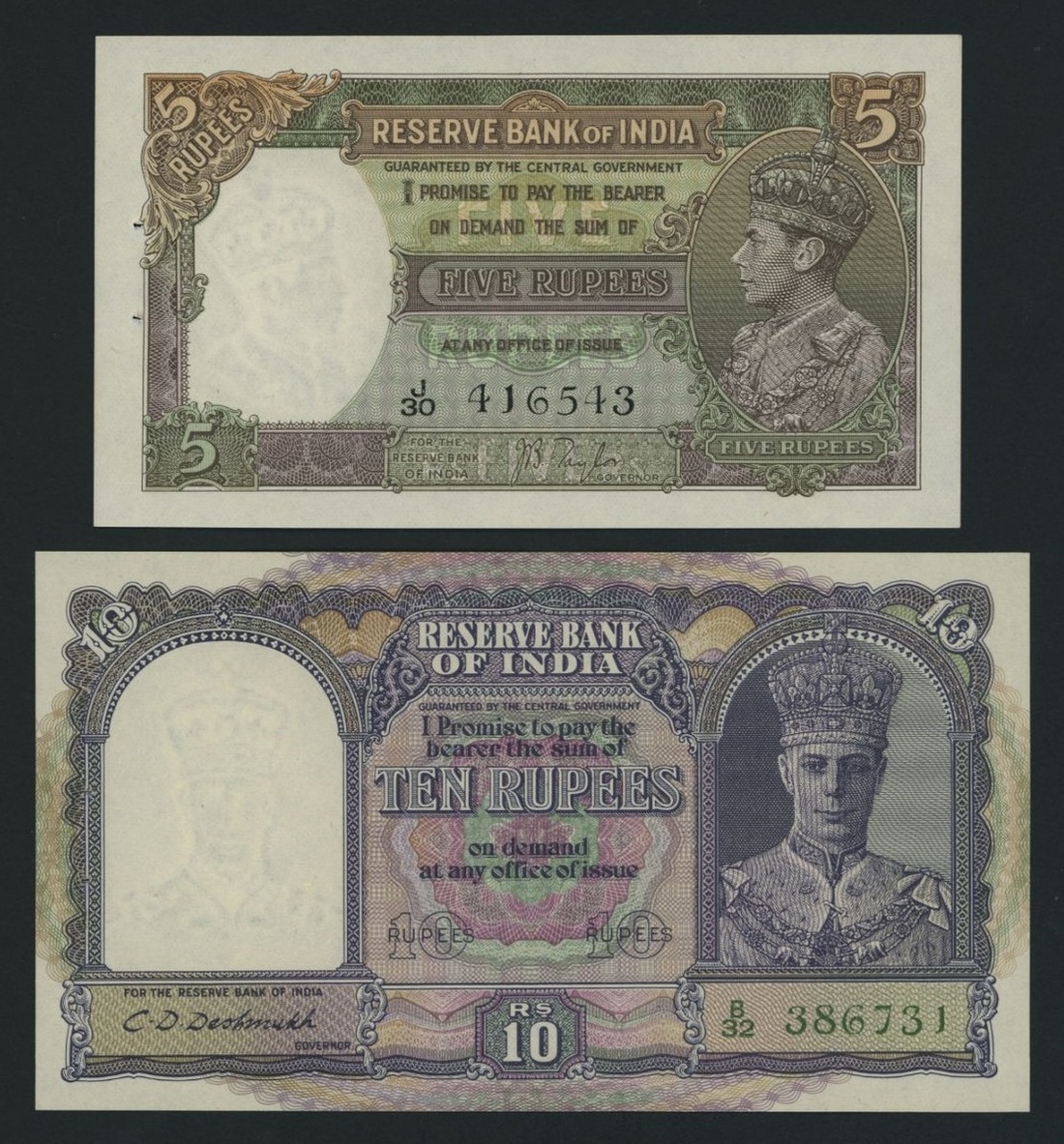 Reserve Bank of India, [2 notes] 5, 10 Rupees, 1938-1944,