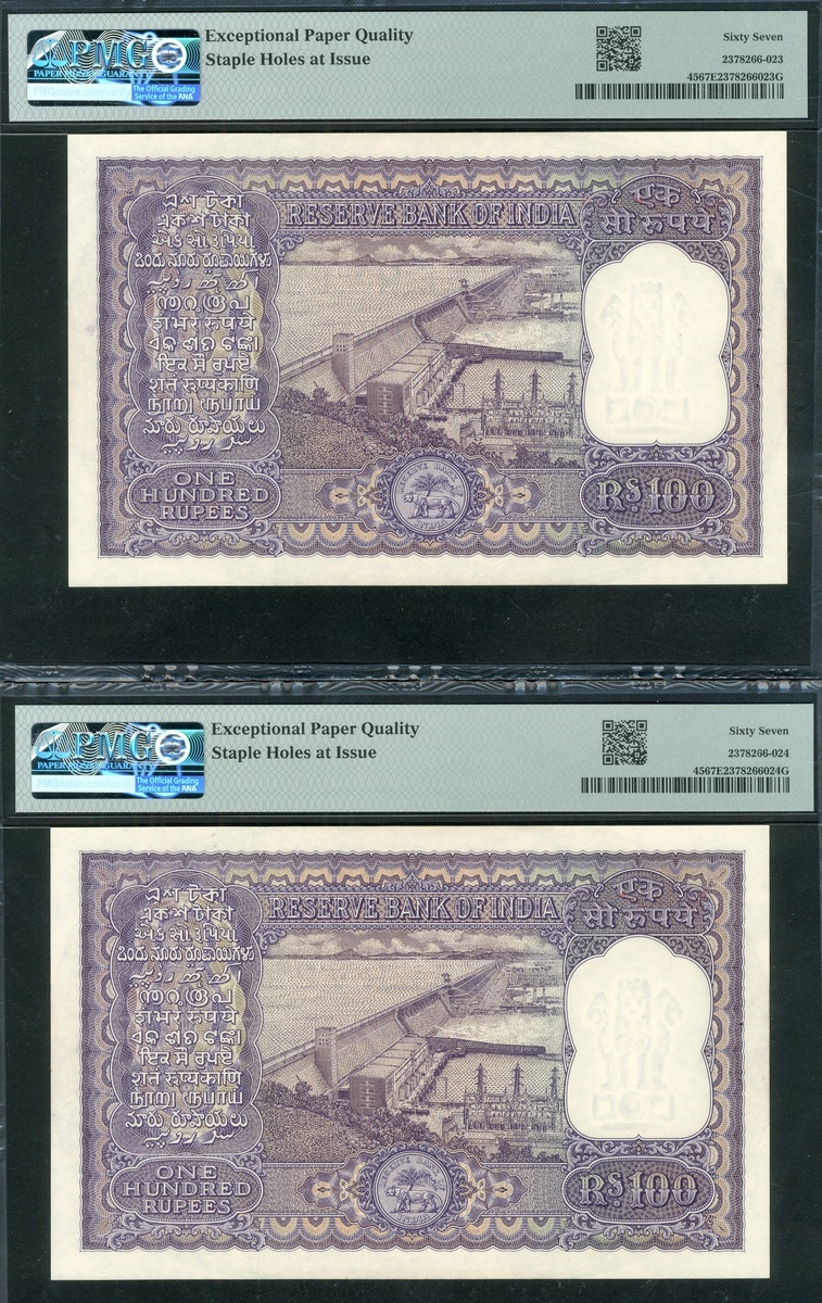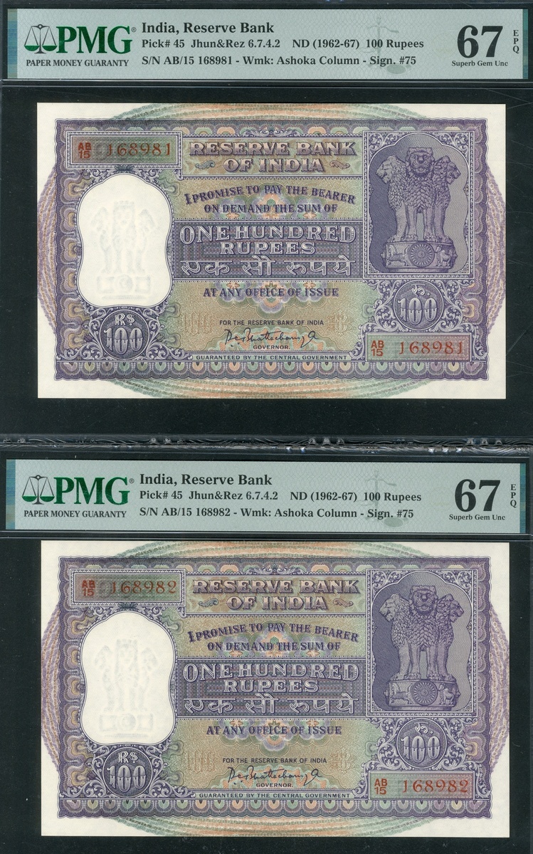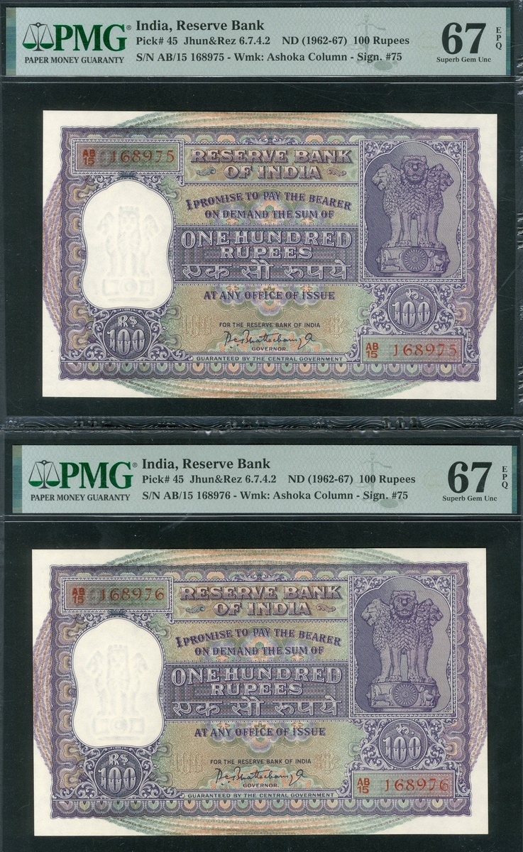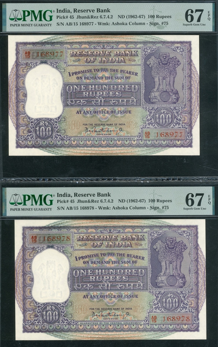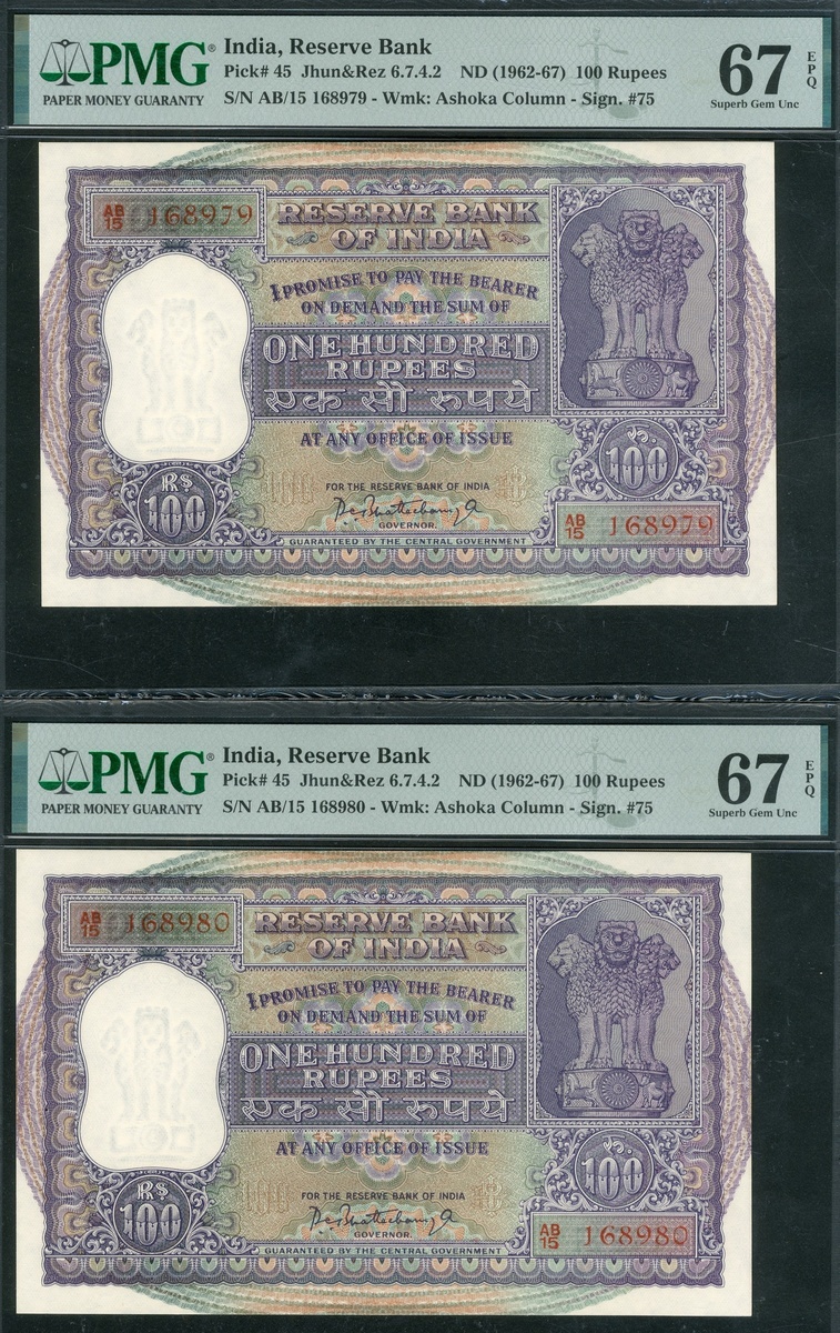 (x) Reserve Bank of India, [9 notes] *TOP POPS* 100 Rupees, ND (1962-67), consecutive serial numbers AB/15 168975-83, (Pick 45), in PMG holders 67 EPQ Superb Gem Uncirculated, staple holes at issue, the highest grade for this note awarded by PMG (9 notes)