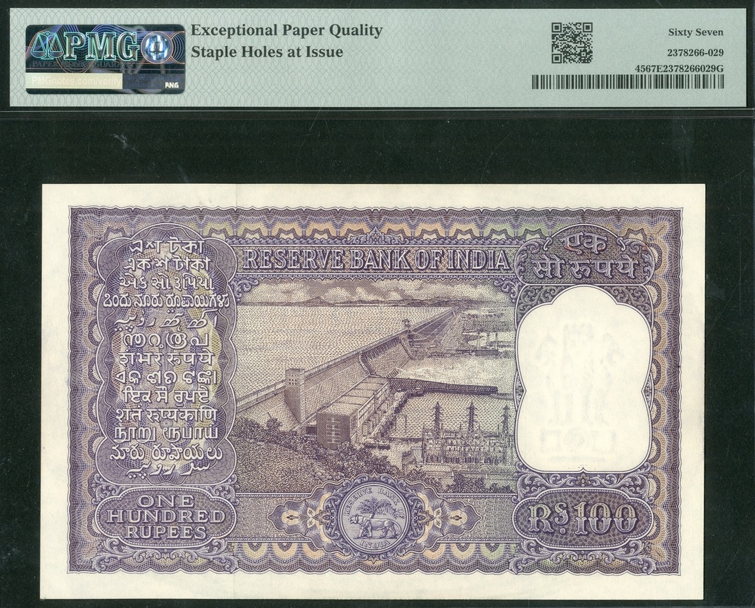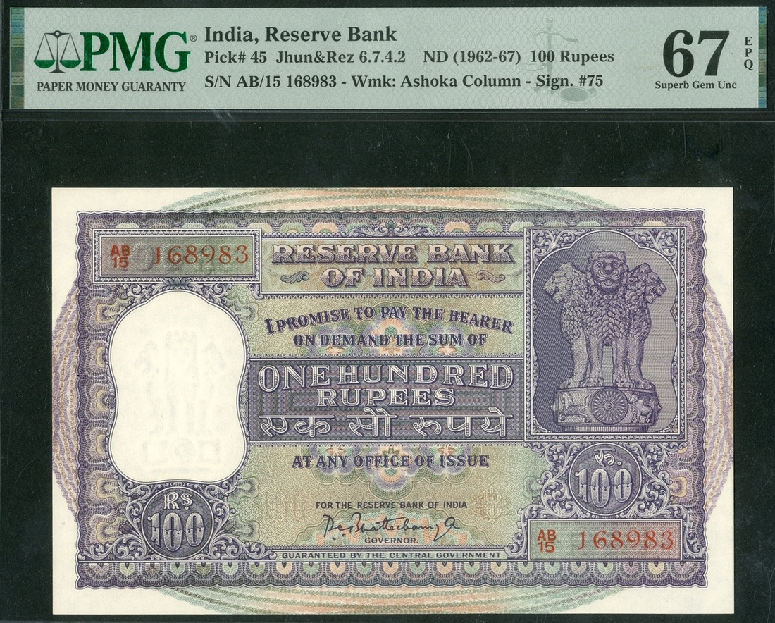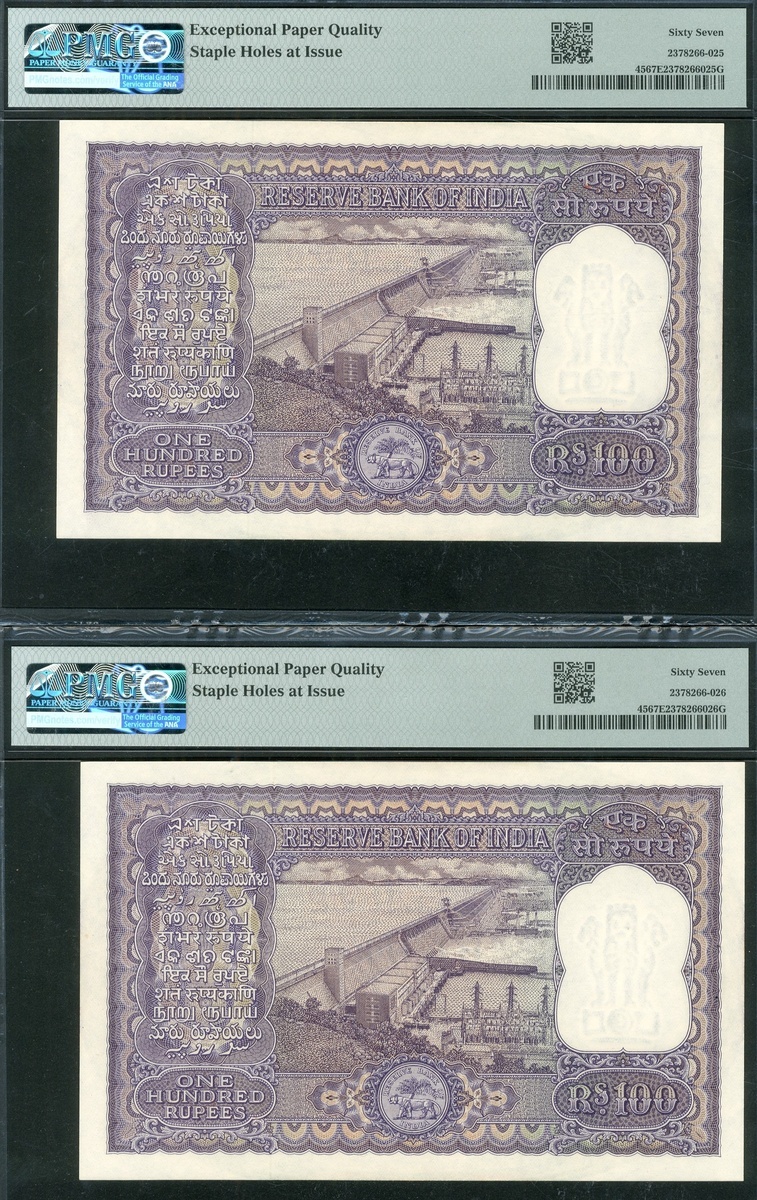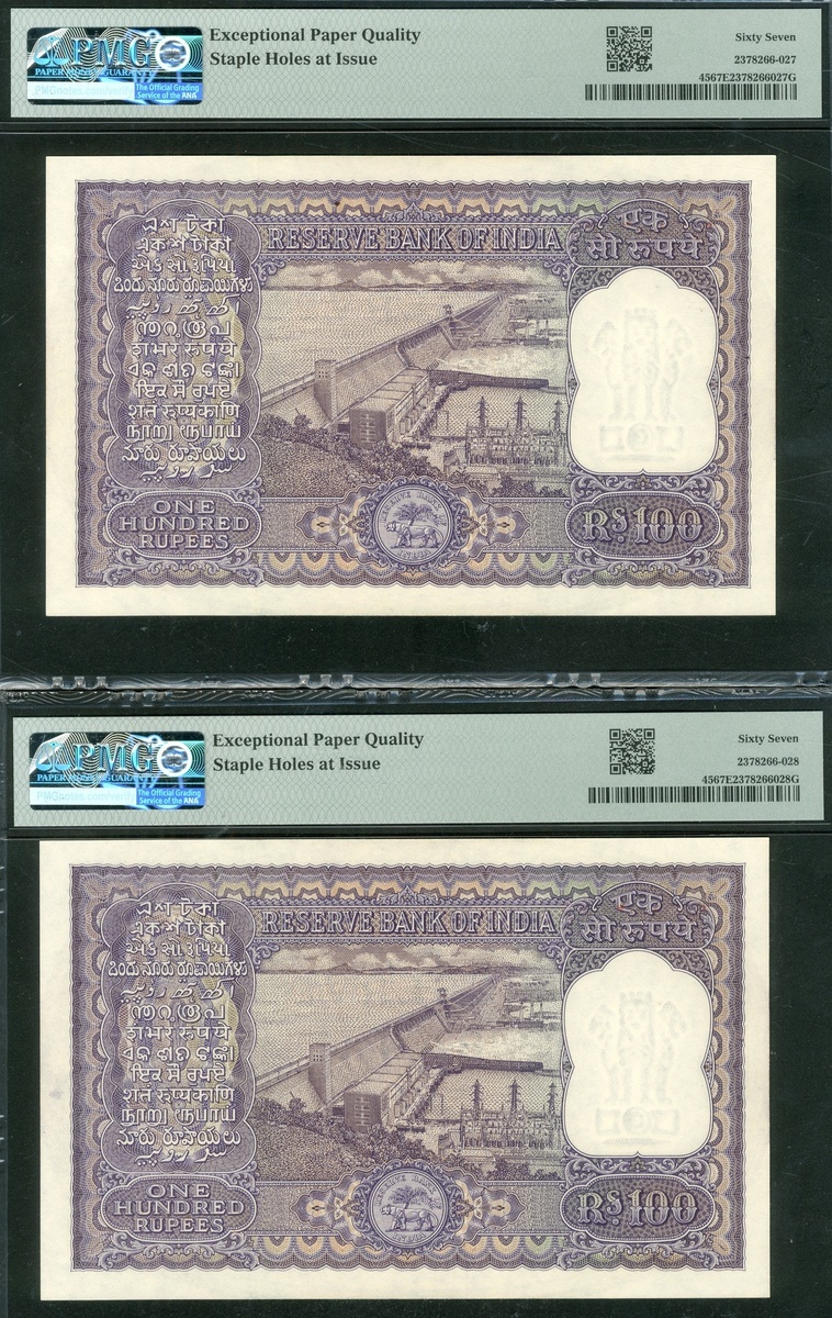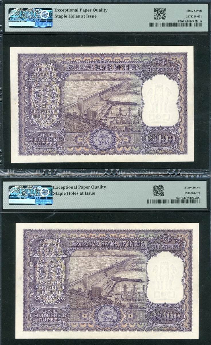 (x) Reserve Bank of India, [9 notes] *TOP POPS* 100 Rupees, ND (1962-67), consecutive serial numbers AB/15 168975-83, (Pick 45), in PMG holders 67 EPQ Superb Gem Uncirculated, staple holes at issue, the highest grade for this note awarded by PMG (9 notes)