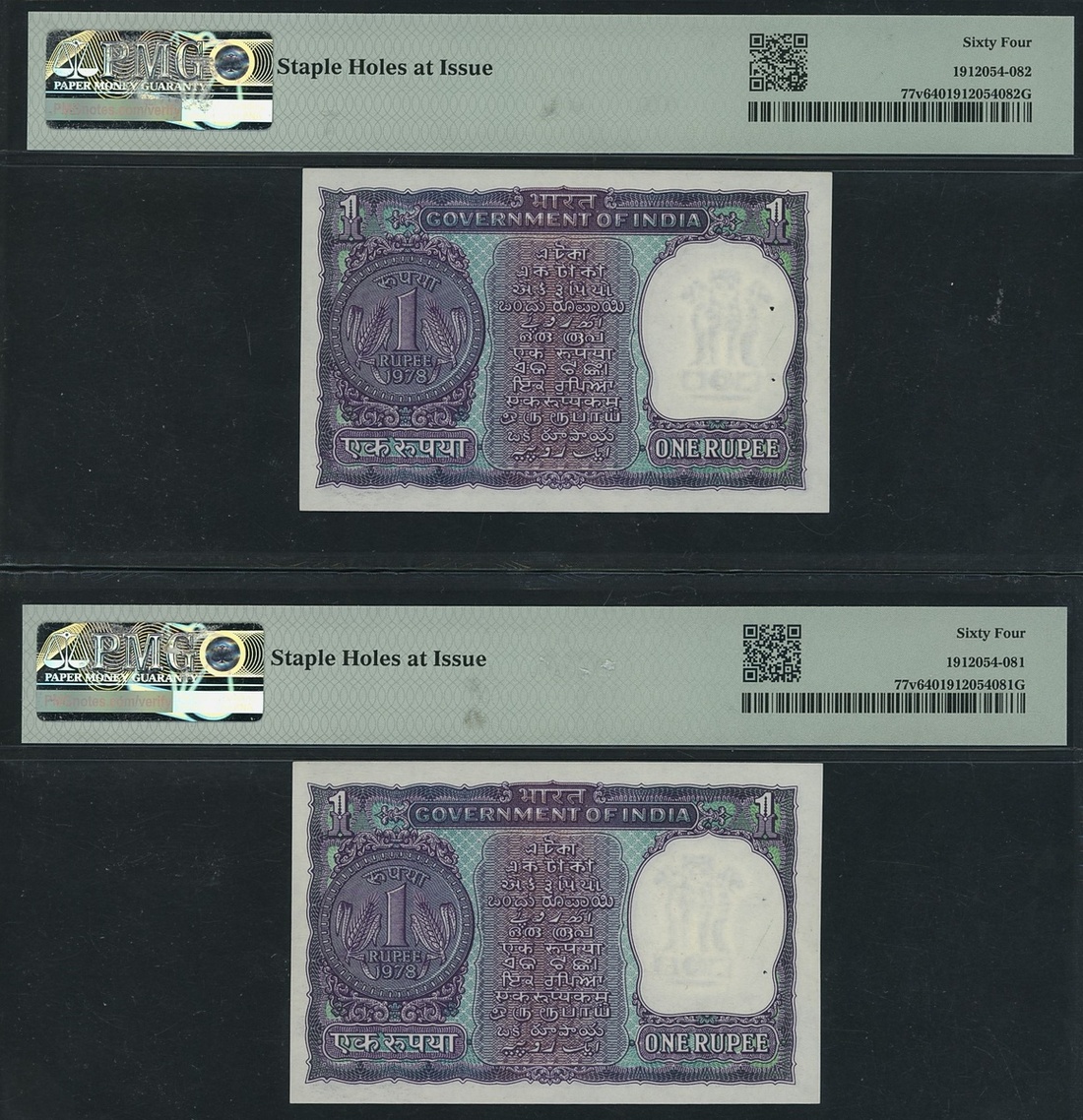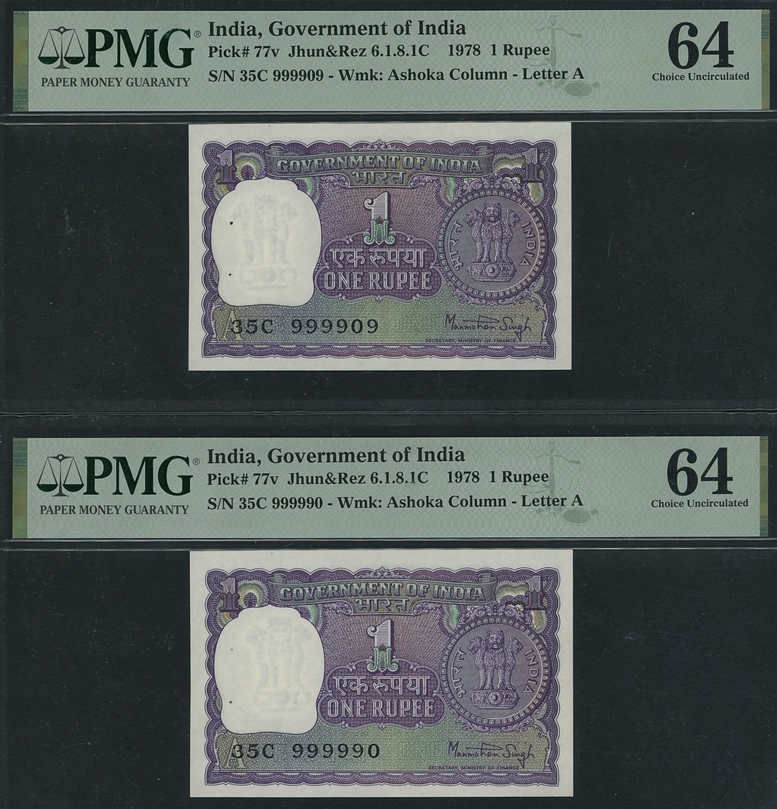 (x) Government of India, [2 notes] 1 Rupee, ND (1978), serial numbers 35C 999909 and 999990, (Pick 77v, BNB 158), both in PMG holder 64 Choice Uncirculated, staple holes at issue (2 notes)