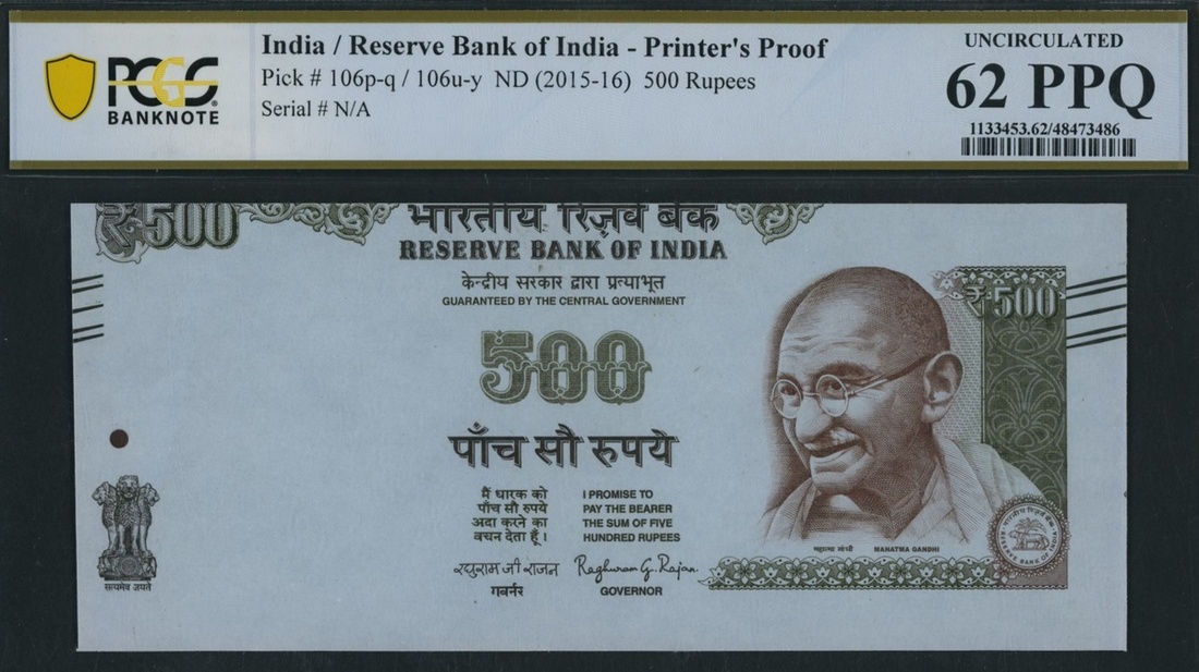 (x) Reserve Bank of India, Printer's Proof, 500 rupees, ND (2015-16), (Pick 106p-q), in PCGS holder 62 PPQ Uncirculated
