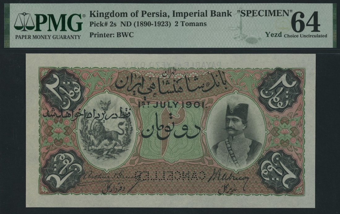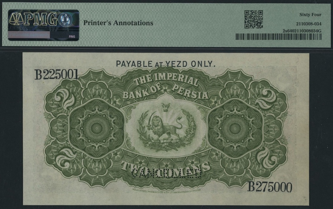 (x) Imperial Bank of Persia, specimen 2 Tomans, Yezd, 1st July 1901, serial number range B225001-B275000, (Pick 2s, BNB 103), in PMG holder 64 Choice Uncirculated, printer´s annotations, only 5 notes in higher grade at PMG census
