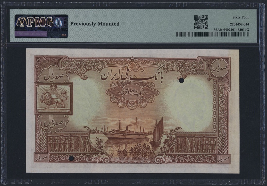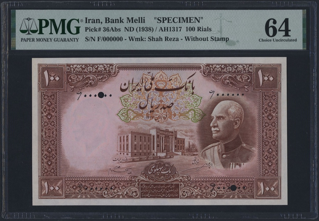 (x) Bank Melli, Iran, *TOP POP* specimen 100 Rials, ND (1938) / AH1317, serial number F/000000, Persian zero serial numbers, brown on multicoloured underprint, portrait of Shah Reza at right, Bank Melli building at centre, reverse steamship and sailing boat, Persian text,
