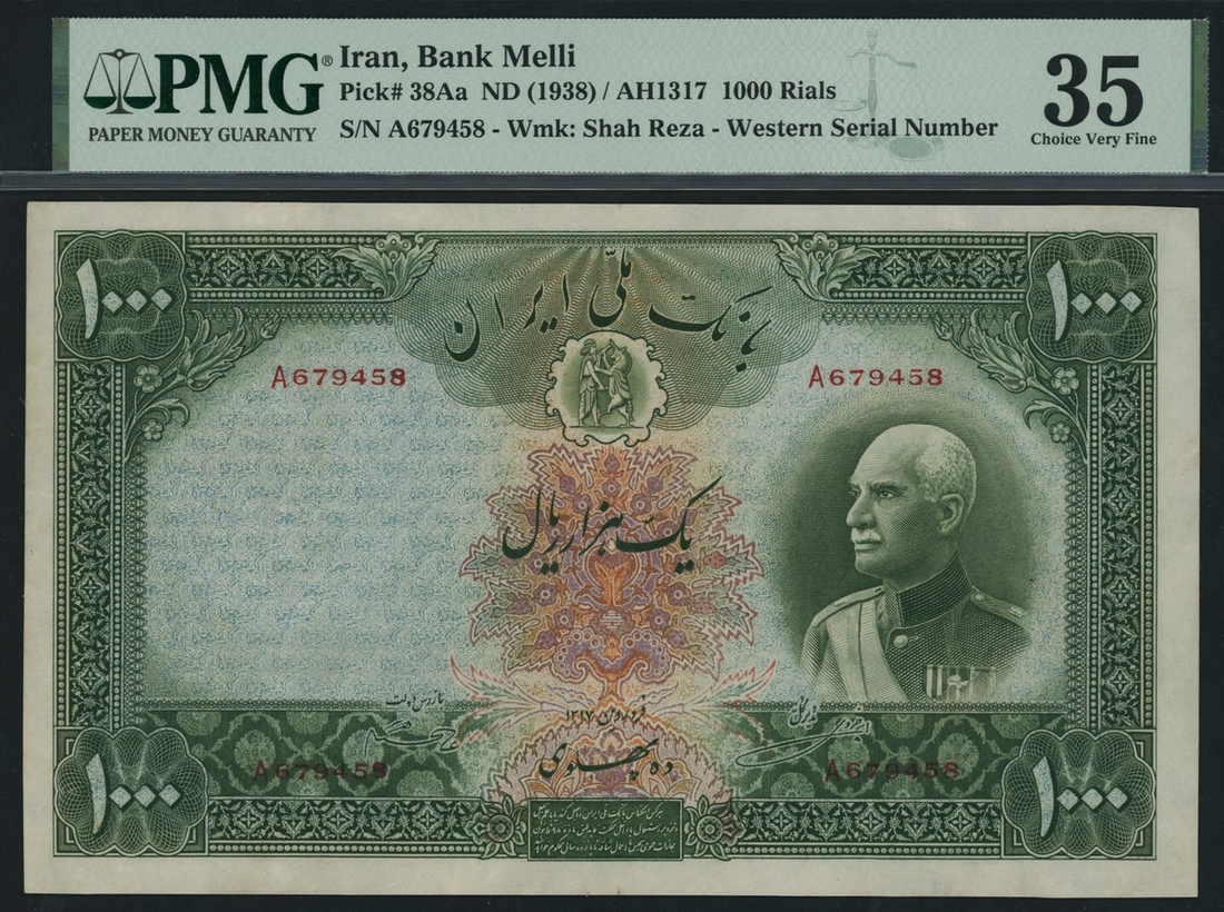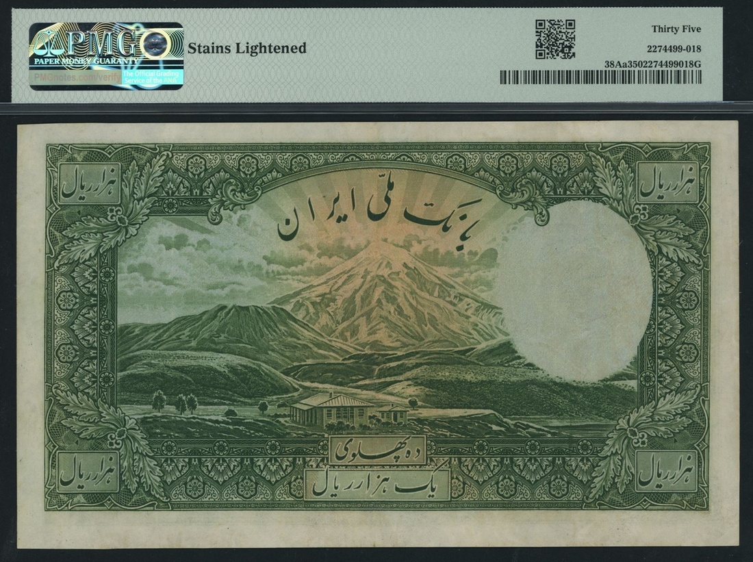 Bank Melli, Iran, 1000 Rials, ND (1938), serial number A679458, (Pick 38Aa), in PMG holder 35 Choice Very Fine, stains lightened. This lot might be subject to import restrictions into certain countries. It is the responsibility of the Buyer to be aware of any restrictions imposed upon importation into the final destination.