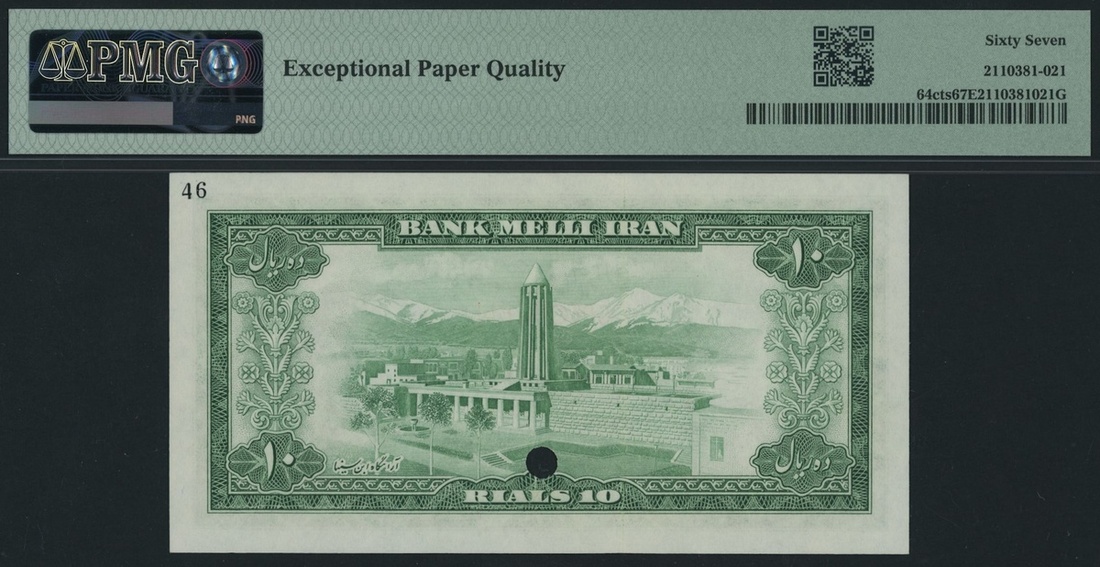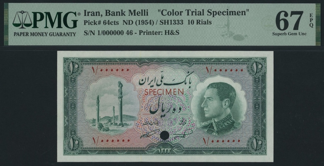 (x) Bank Melli, Iran, *TOP POP* colour trial specimen 10 Rials, ND (1954) / SH1333, serial number 1/000000 46, (Pick 64cts, BNB 154), in PMG holder 67 EPQ Superb Gem Uncirculated. This note is the Single Finest graded for the typo on PMG census. This lot might be subject to import restrictions into certain countries. It is the responsibility of the Buyer to be aware of any restrictions imposed upon importation into the final destination.