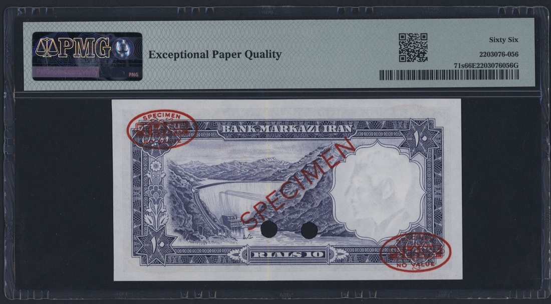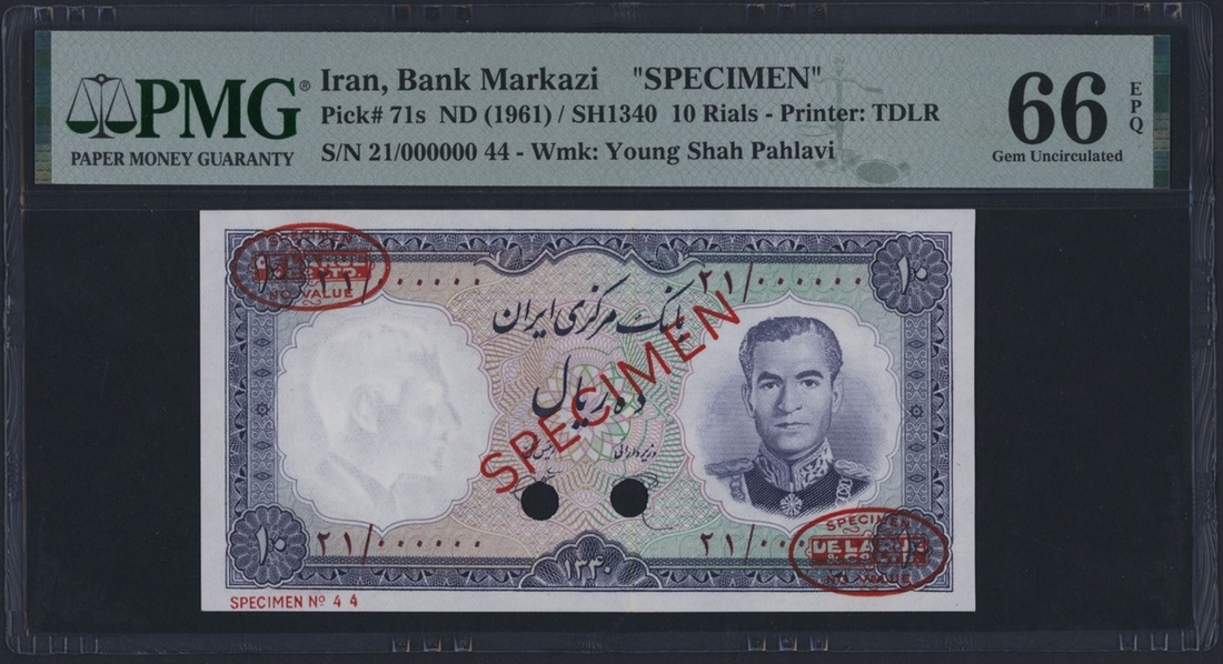 (x) Bank Markazi, Iran, specimen 10 Rials, ND (1961) / SH1340, serial number 21/000000 44, (Pick 71s, BNB 201), in PMG holder 66 EPQ Gem Uncirculated, only 5 notes in higher grade on PMG Census. This lot might be subject to import restrictions into certain countries. It is the responsibility of the Buyer to be aware of any restrictions imposed upon importation into the final destination.