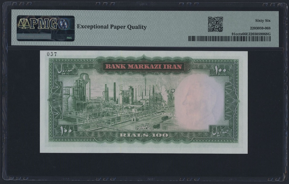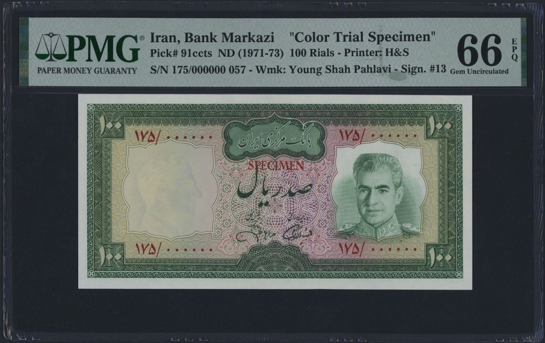 (x) Bank Markazi, Iran, Colour Trial Specimen 100 Rials, ND (1971-73), serial number 175/000000 057, (Pick 91ccts), in PMG holder 66 EPQ Gem Uncirculated, only 2 notes in higher grade on PMG Census. This lot might be subject to import restrictions into certain countries. It is the responsibility of the Buyer to be aware of any restrictions imposed upon importation into the final destination.