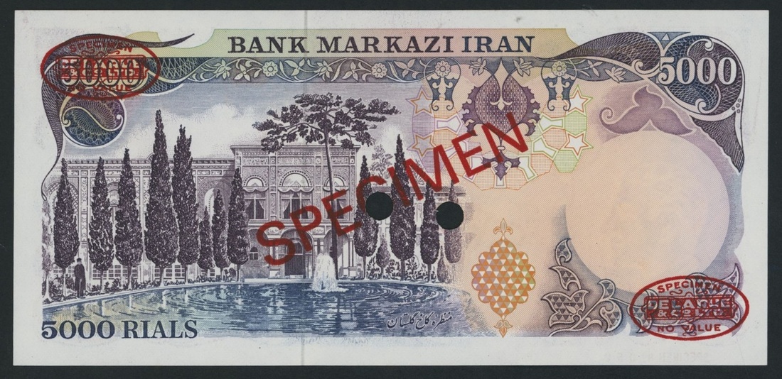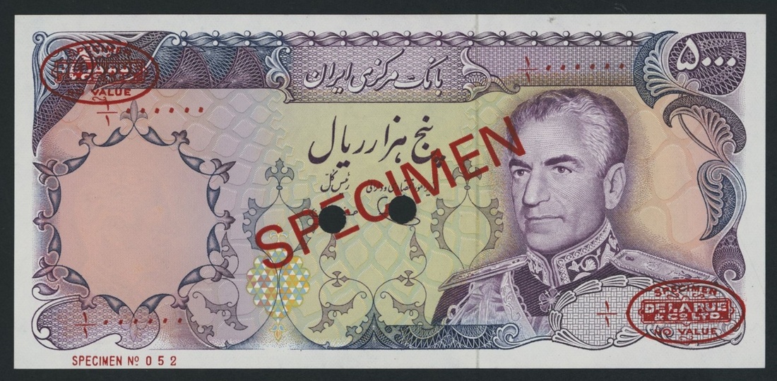 (x) Bank Markazi, Iran, specimen 5000 Rials, ND (1974), specimen number 052, (Pick 106s), uncirculated, with "SPECIMEN" overprint and De La Rue stamps above left and below right, perforated. This lot might be subject to import restrictions into certain countries. It is the responsibility of the Buyer to be aware of any restrictions imposed upon importation into the final destination.