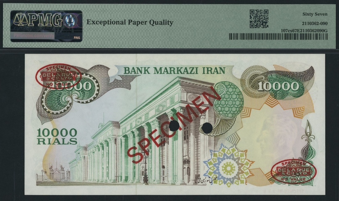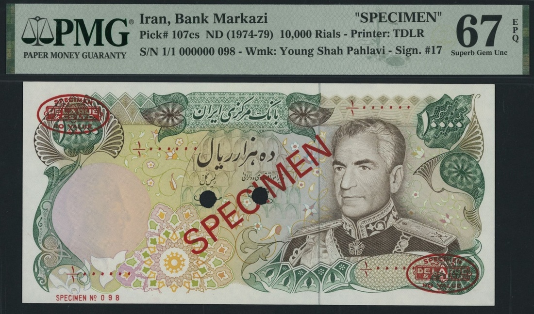 (x) Bank Markazi, Iran, specimen, 10,000 Rials ND (1974-79), serial number 1/1 000000 098, (Pick 107cs, BNB 239), in PMG holder 67 EPQ Superb Gem Uncirculated, only 1 note graded higher at PMG census. This lot might be subject to import restrictions into certain countries. It is the responsibility of the Buyer to be aware of any restrictions imposed upon importation into the final destination.