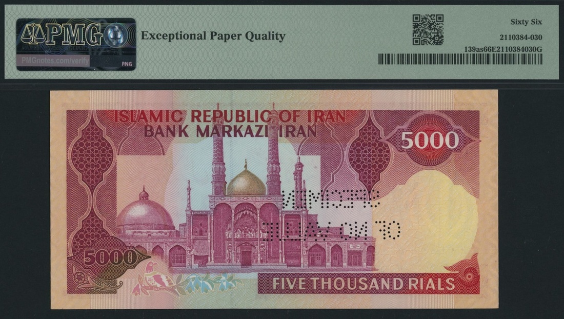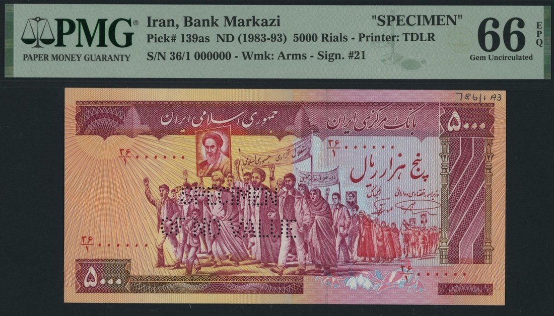(x) Bank Markazi, Iran, specimen 5000 Rials, ND (1983-93), serial number 36/1 000000, (Pick 139as, BNB 273), in PMG holder 66 EPQ Gem Uncirculated, only 3 notes graded higher on PMG census