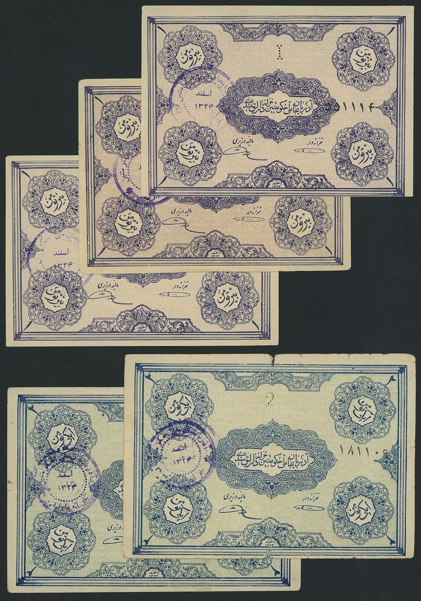 perforated denominations, hand stamps, handwritten Persian text on reverse, all about good fine to good very fine. This lot might be subject to import restrictions into certain countries. It is the responsibility of the Buyer to be aware of any restrictions imposed upon importation into the final destination.