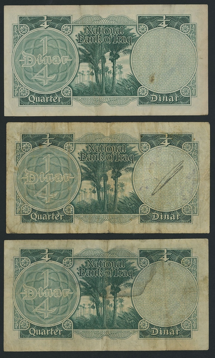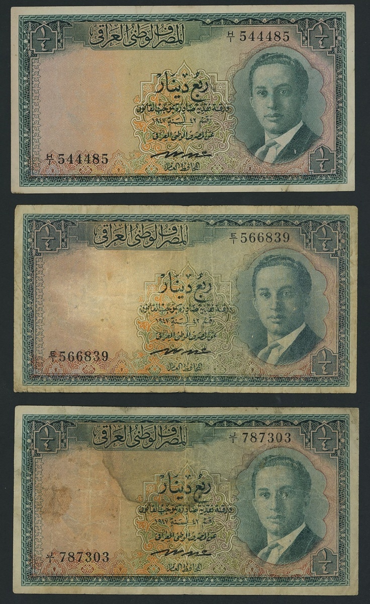 (x) Government of Iraq, [3 notes] 1/4 Dinar, 1947, serial numbers H/1 54485, E/1 566839, J/1 787303, King Faisal II as young man