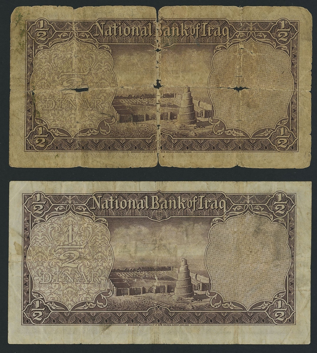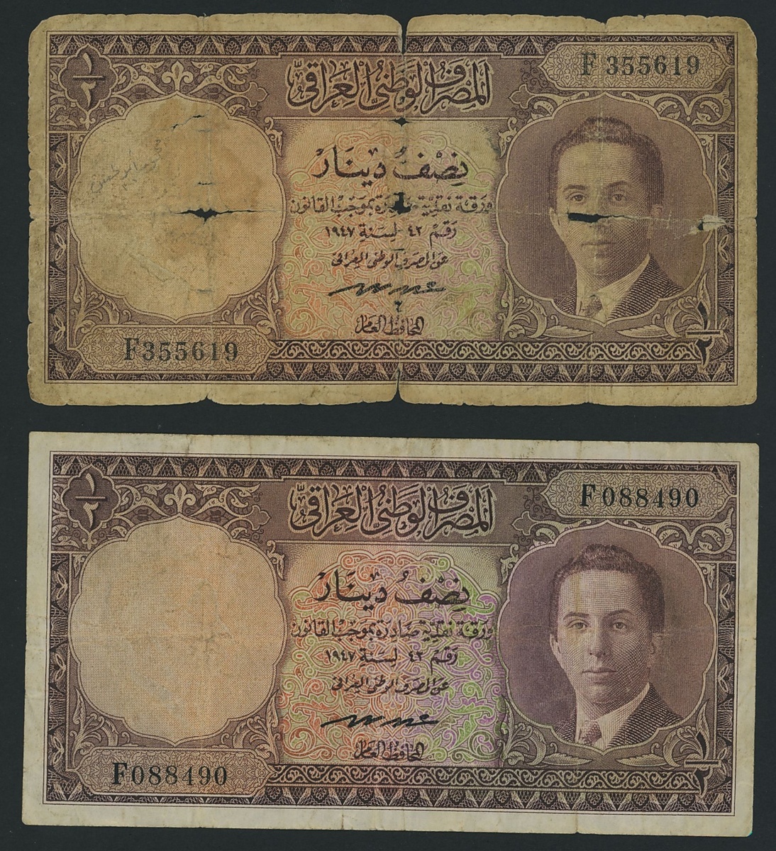 (x) Government of Iraq, [2 notes] 1/2 Dinar, 1947, serial numbers F 355619, F 088490, King Faisal II as older youth,