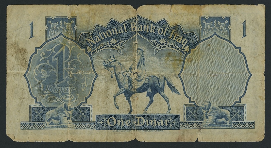 (x) National Bank of Iraq, 1 Dinar, 1947, serial number C/1 572700, (Pick 34), about fine, pieces missing from margin and some stains