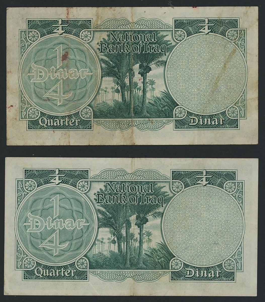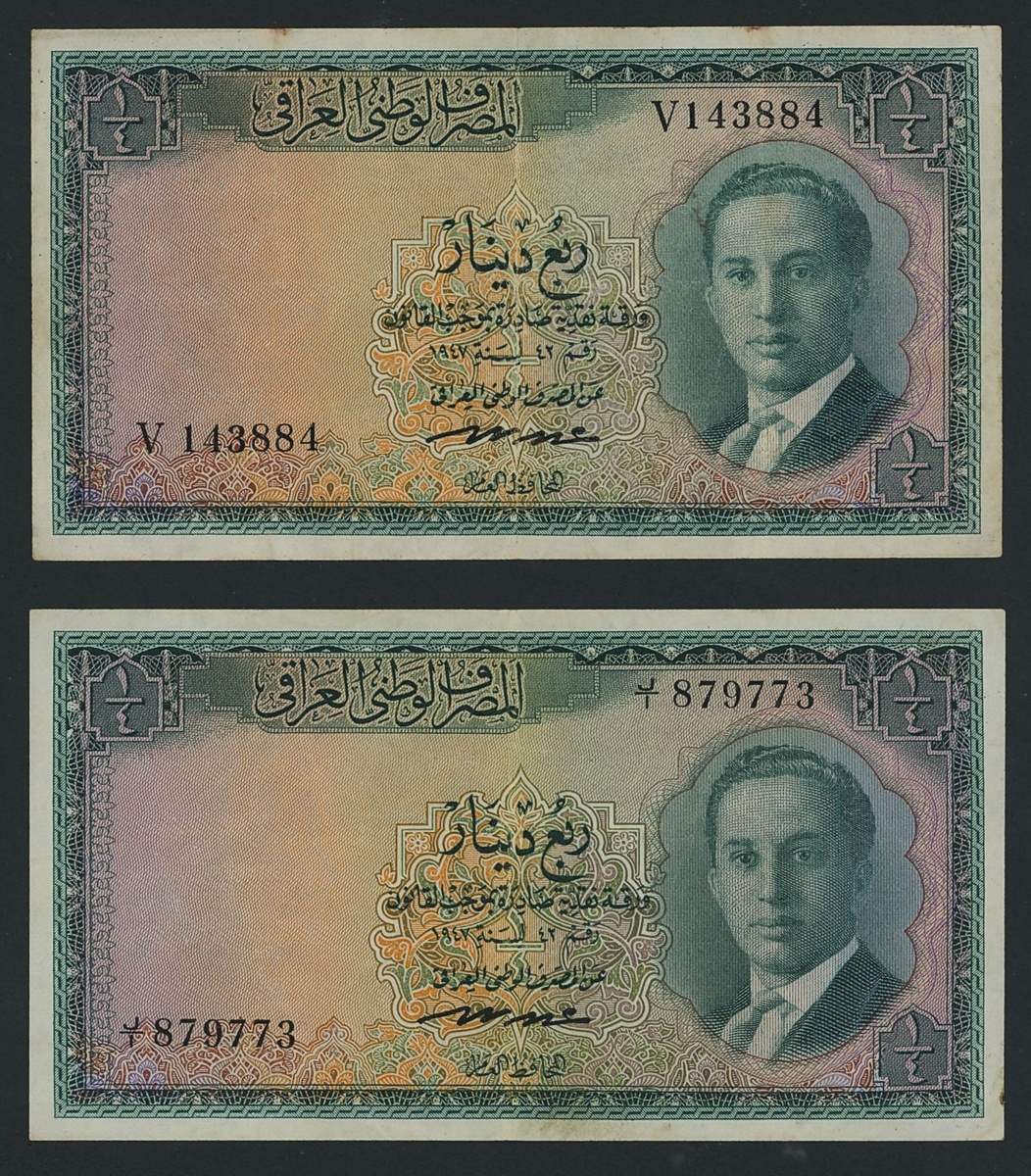(x) Government of Iraq, [2 notes] 1/4 Dinar, 1947, serial numbers V 143884, J/1 879773 King Faisal II as young man,
