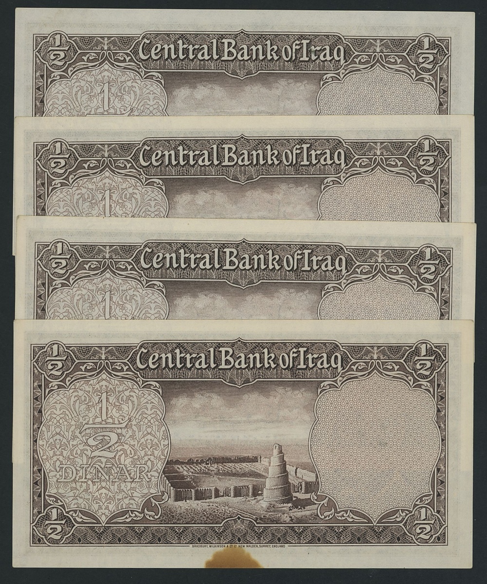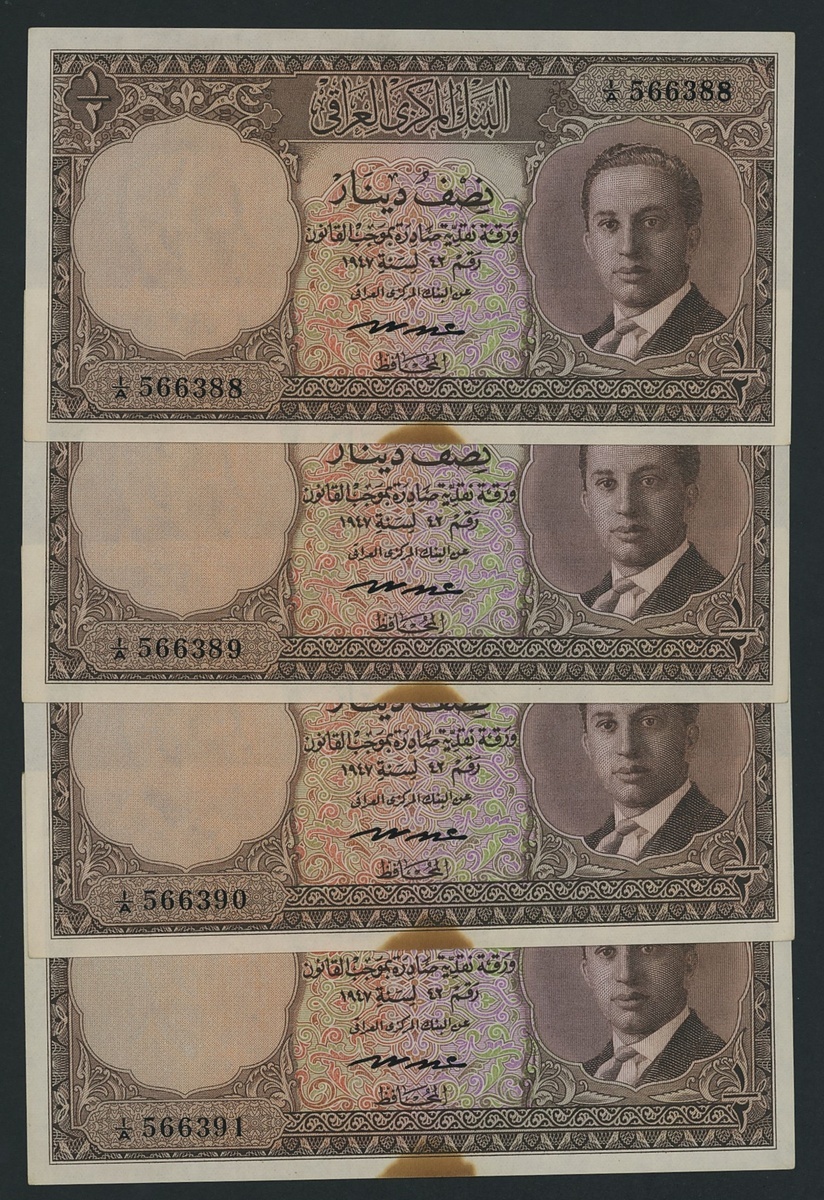 (x) Government of Iraq, [4 notes] 1/2 Dinar, 1947, consecutive serial numbers 1/A 566388, -89, -90, -91, King Faisal II as young man,