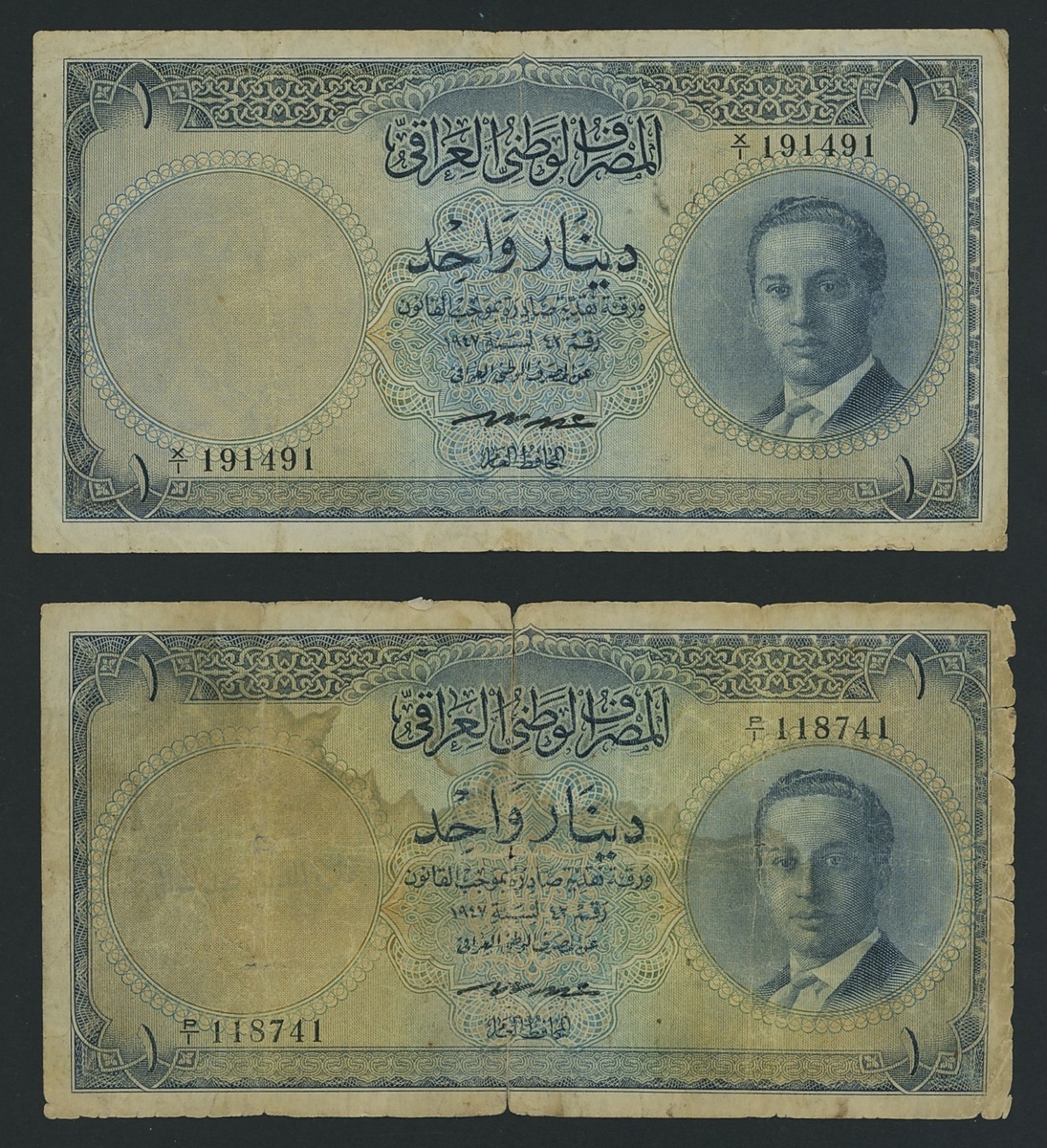 (x) Government of Iraq, [2 notes] 1 Dinar, 1947, serial numbers X/1 191491, P/1 118741, King Faisal II as young man,