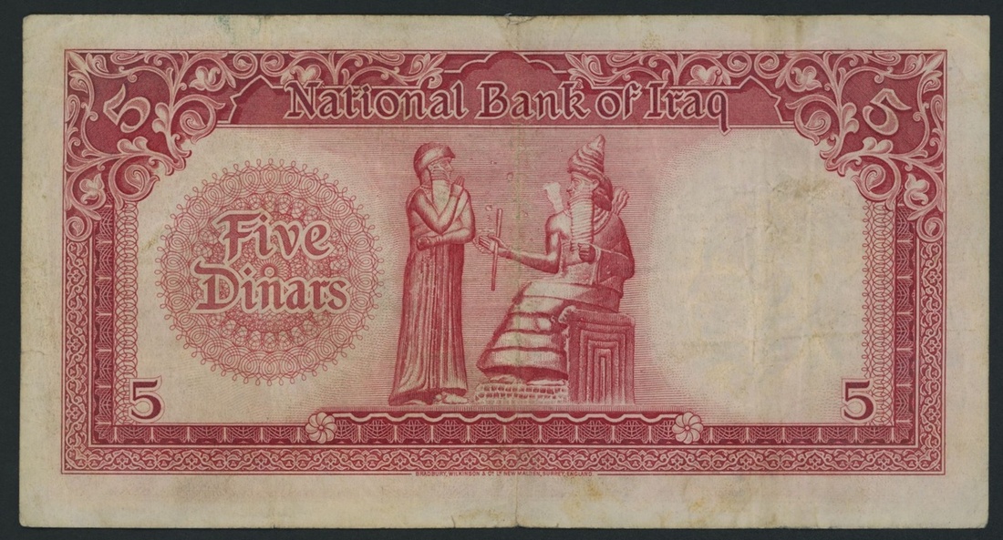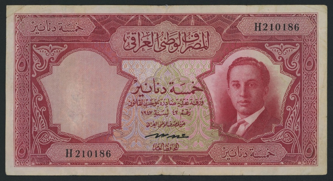(x) Government of Iraq, 5 Dinars, 1947, serial number H 210186, (Pick 40, BNB B214b), fine