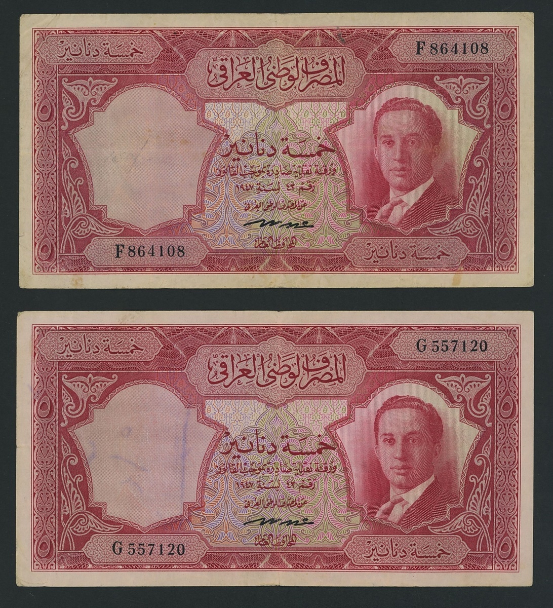(x) Government of Iraq, [2 notes] 5 Dinar, 1947, serial numbers F 864108, G 557120, King Faisal II as young man,