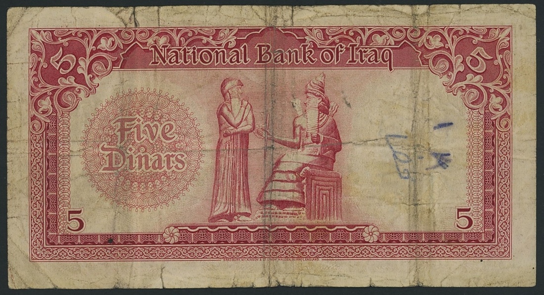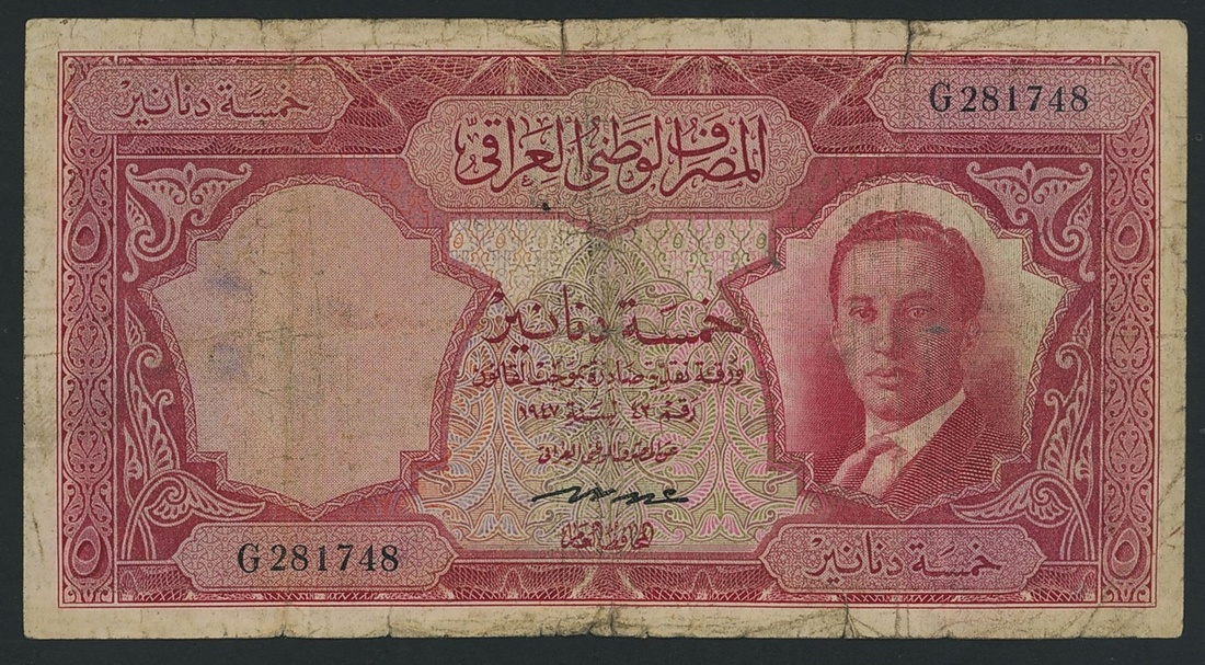 (x) Government of Iraq, 5 Dinar, 1947, serial number G 281748, King Faisal II as young man,