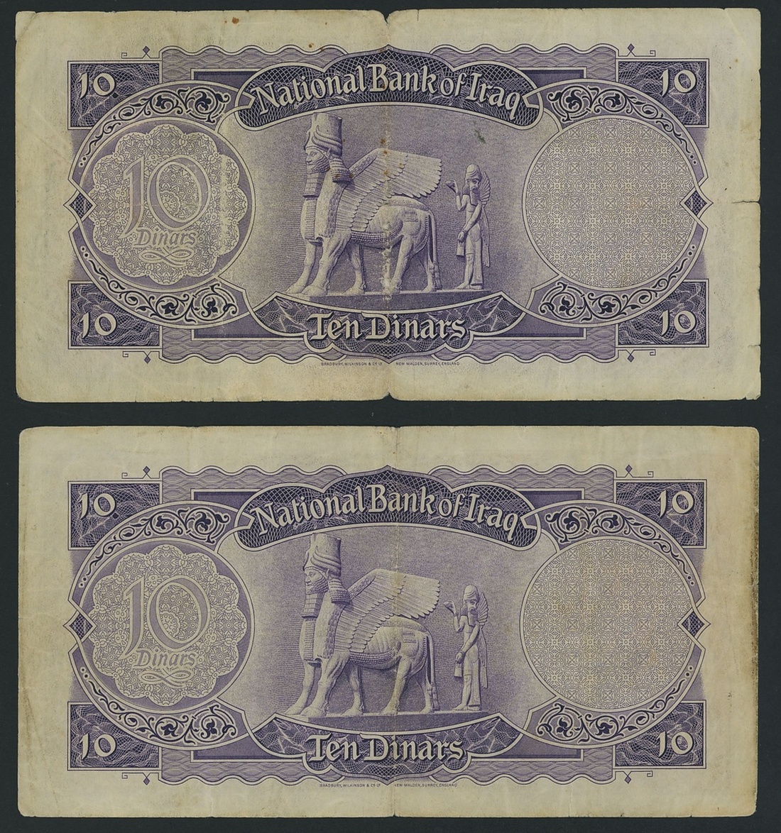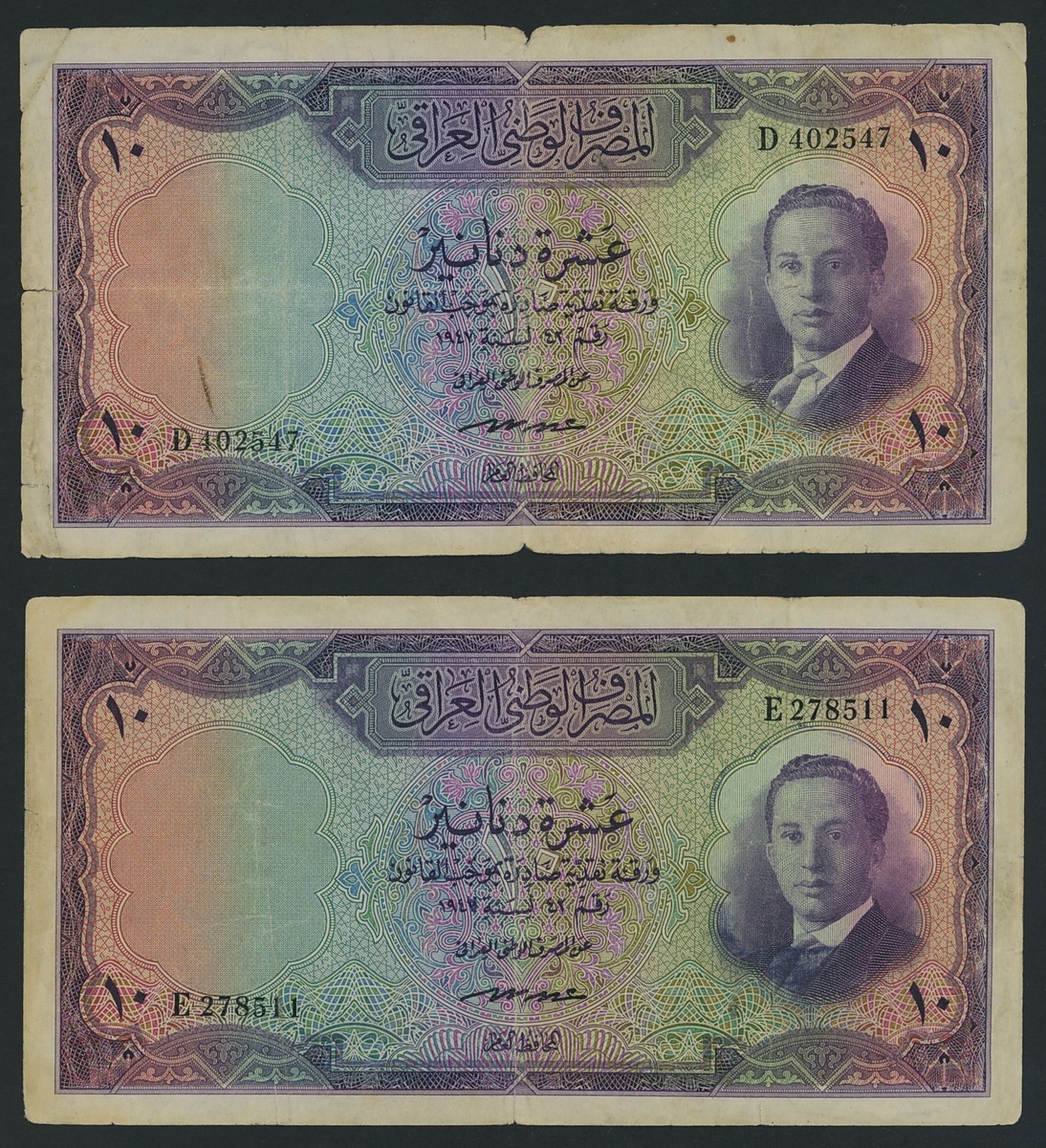 (x) Government of Iraq, [2 notes] 10 Dinar, 1947, serial numbers D 402547, E 278511 King Faisal II as young man,