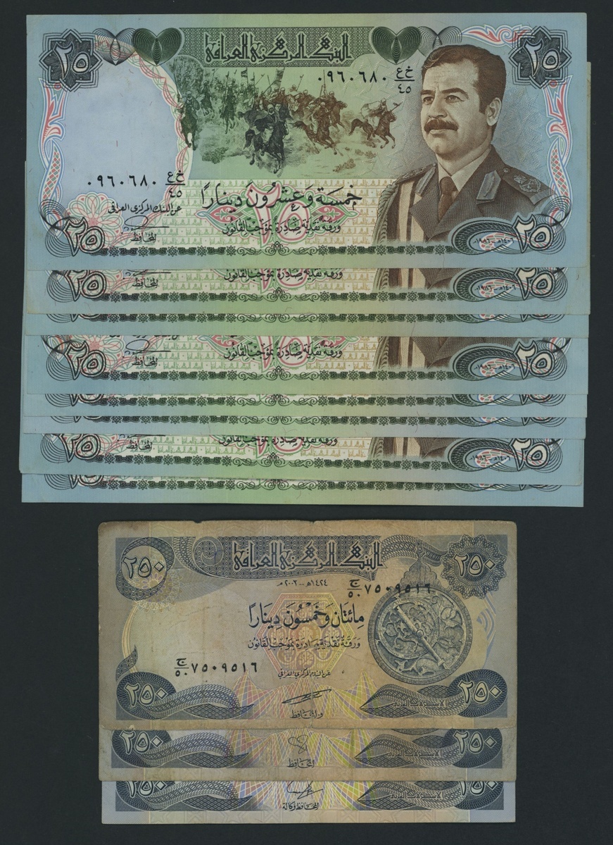 (x) Central Bank of Iraq, 1/2, 1, 25 & 250 Dinars, 1985-2013, including 32 consecutive serial number 1/2 Dinar notes, 239708-739, (Pick 68b, 69c, 73a, 91a, 91b), fine to about uncirculated