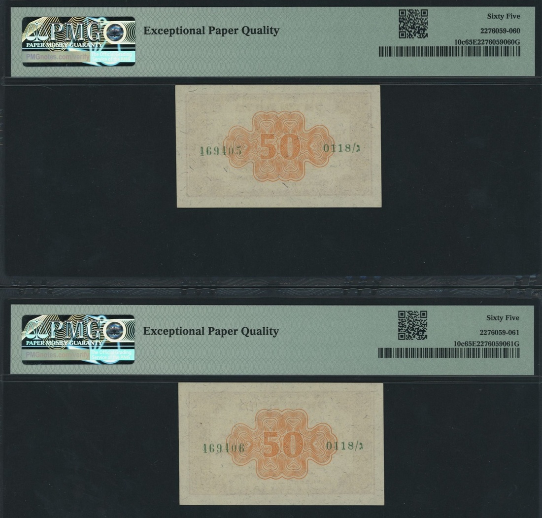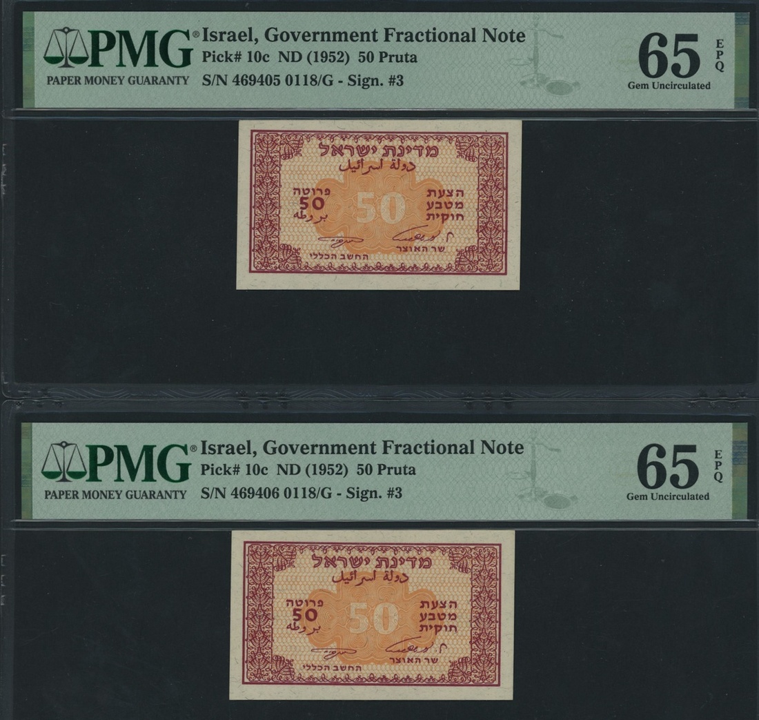 (x) Government Fractional Note, Israel, [2 notes] 50 Pruta, ND (1952), consecutive serial numbers 469405-6 0118/G, (Pick 10c, BNB 205), both in PMG holders 65 EPQ Gem Uncirculated (2 notes)