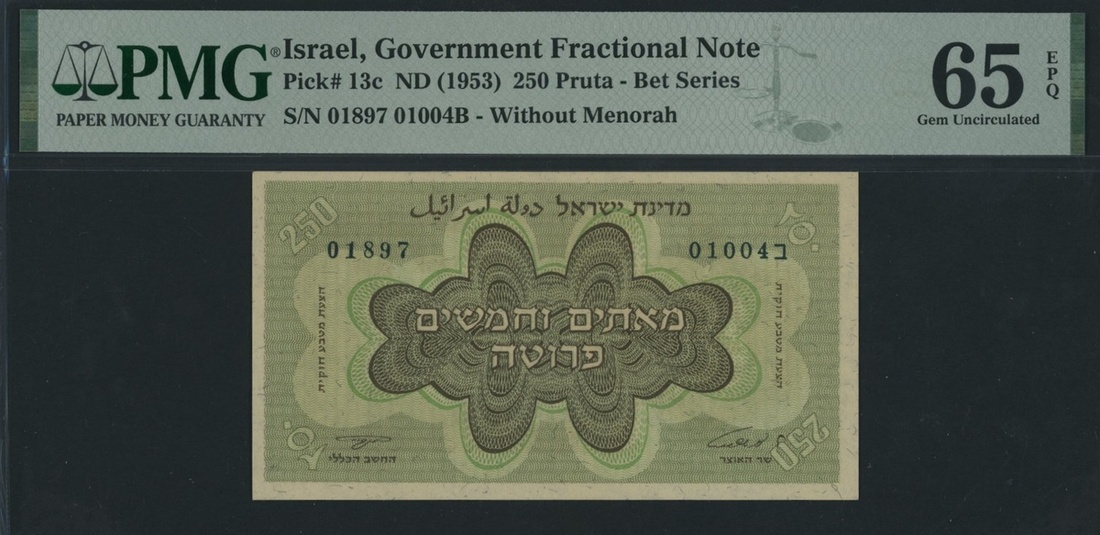 (x) State of Israel Fractional Note, 250 Prutah, ND (1953), serial number 01897 01004B, (Pick 13c, BNB 208c), in PMG holder 65 EPQ Gem Uncirculated, only 6 notes in higher grade on PMG census