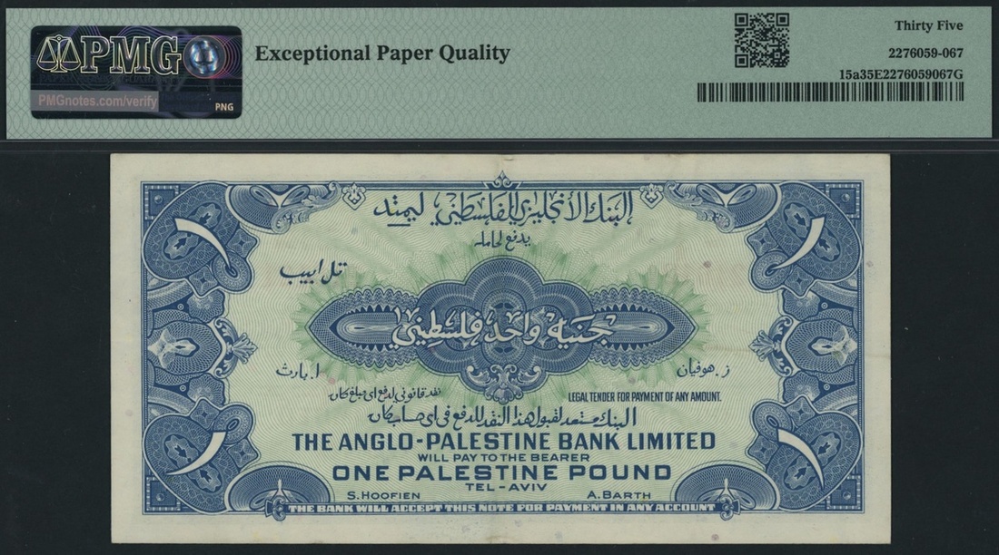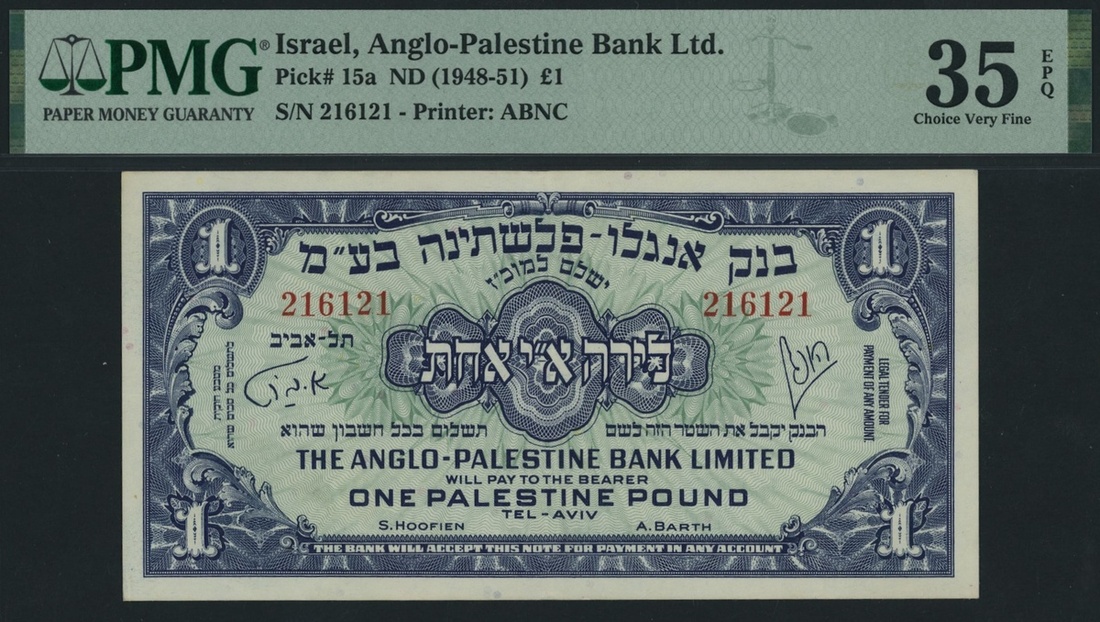 (x) Anglo-Palestine Bank Limited, Israel, 1 Palestine Pound, Tel Aviv, ND (1948-51), serial number 216121, (Pick 15a, BNB 107), in PMG holder 35 EPQ Choice Very Fine