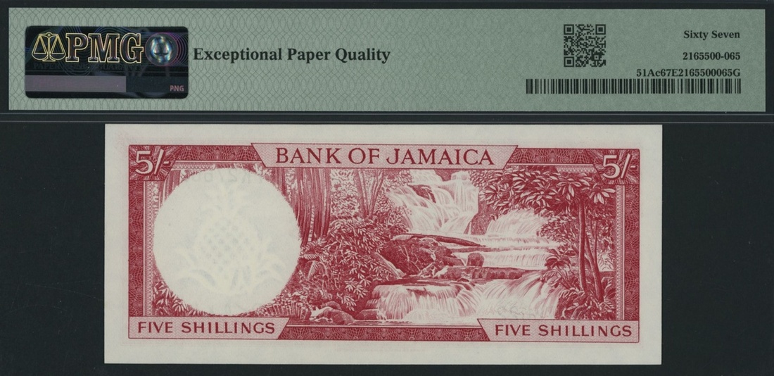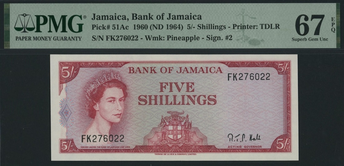 Bank of Jamaica, *TOP POP* 5/- Shillings, 1960 (ND 1964), serial number FK276022, (Pick 51Ac), in PMG holder 67 EPQ Superb Gem Uncirculated, tied for Finest graded on PMG census