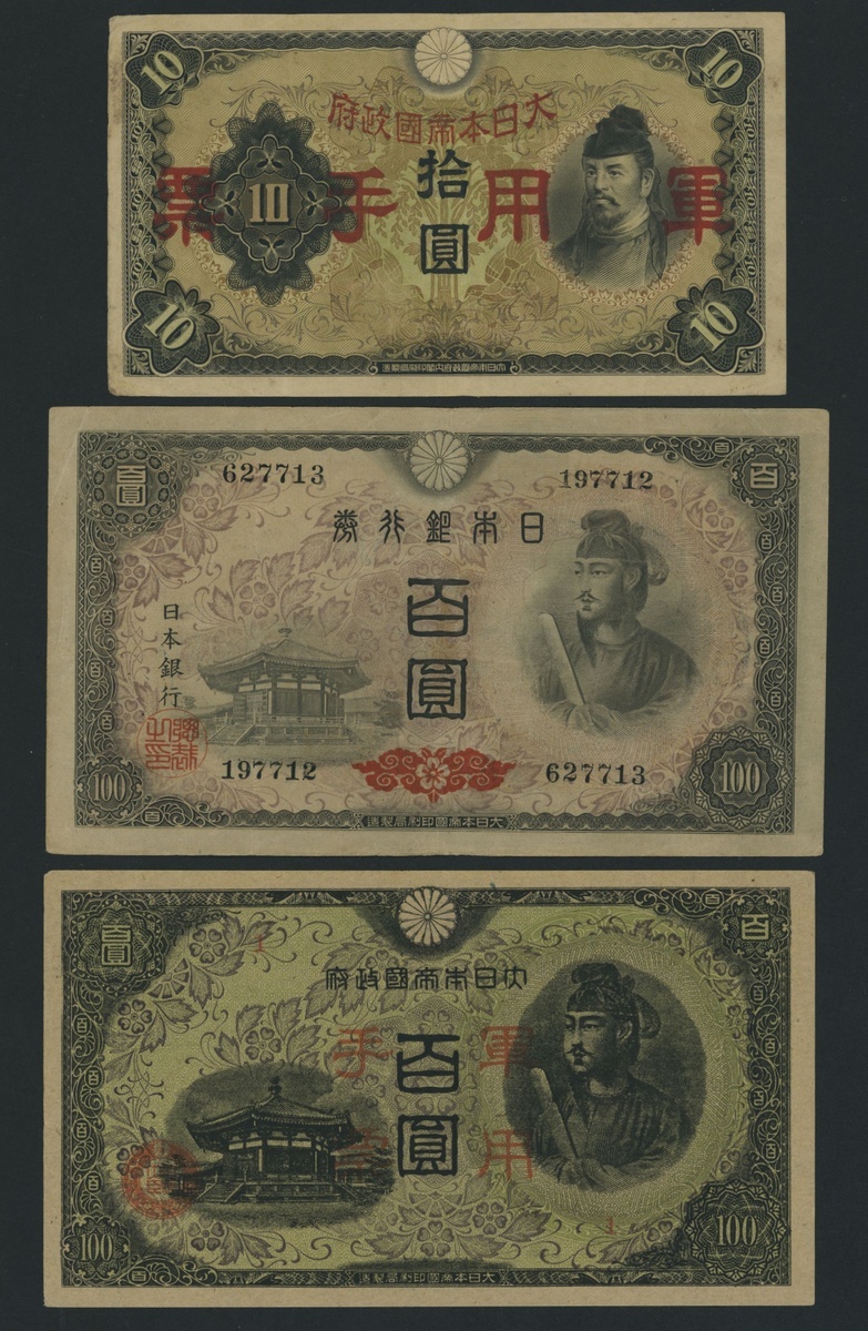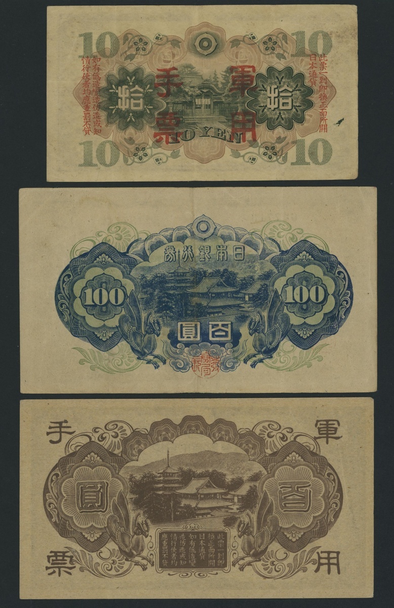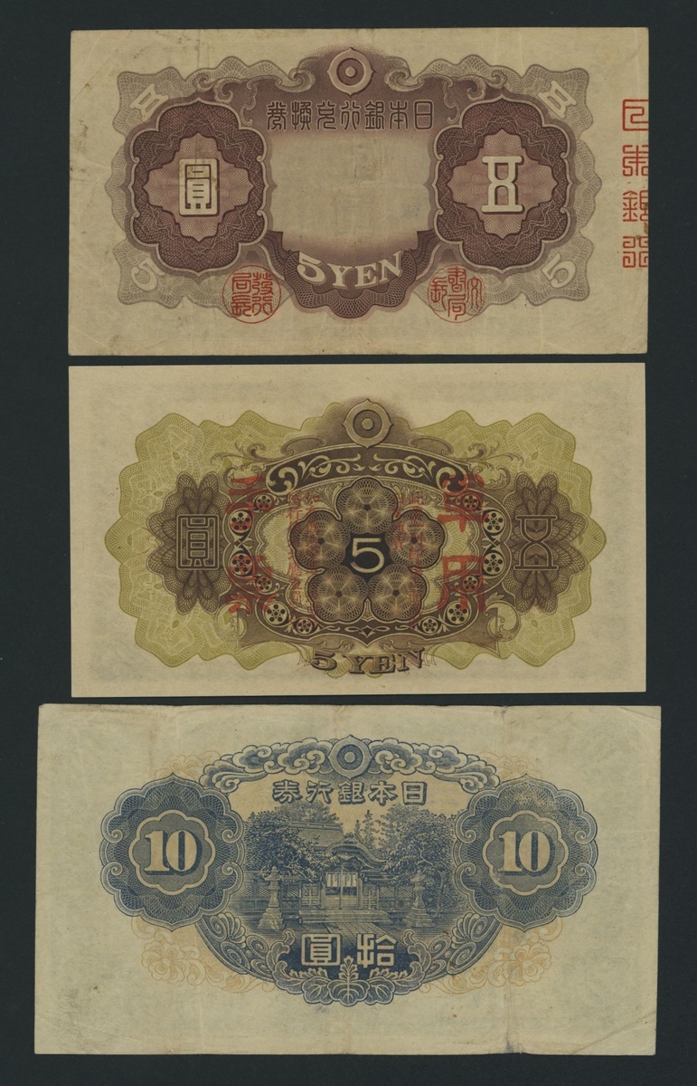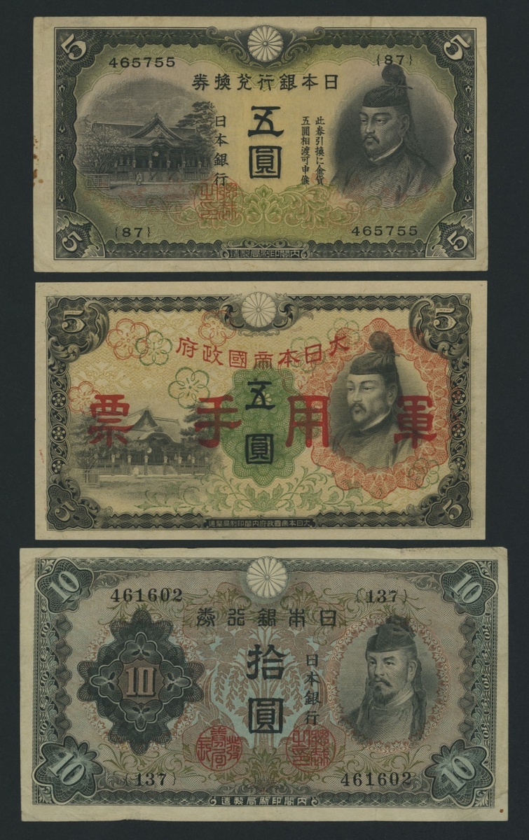 Group of Japanese notes, Bank of Japan, Japan Military Issue, [6 notes] 5, 10 & 100 Yen, (Pick 43, 51, 89, M25, M27, M29), good fine to good very fine