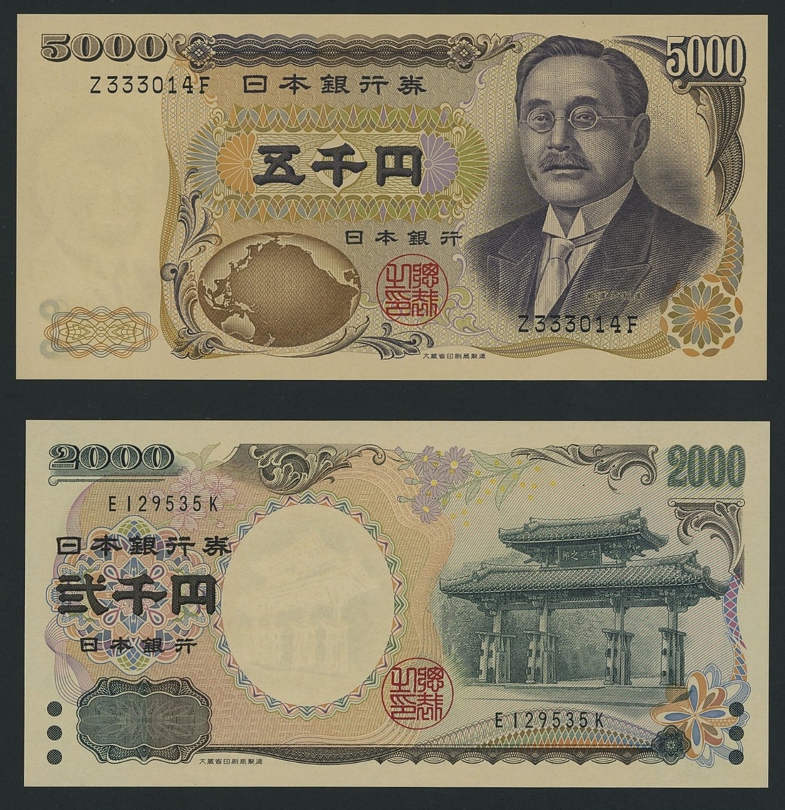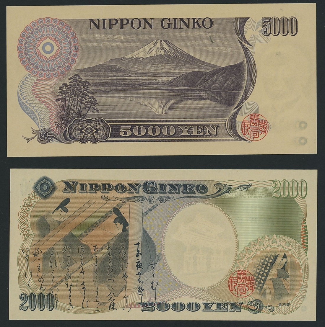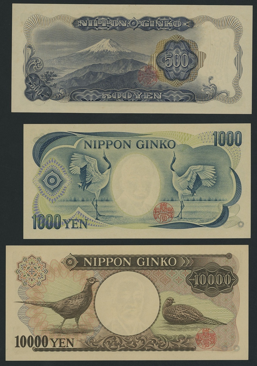 Bank of Japan, [5 notes] 500, 1000, 2000, 5000, 10000 Yen, 1984-2000, (Pick 95b, 97a, 98a, 99b, 103a), all about uncirculated