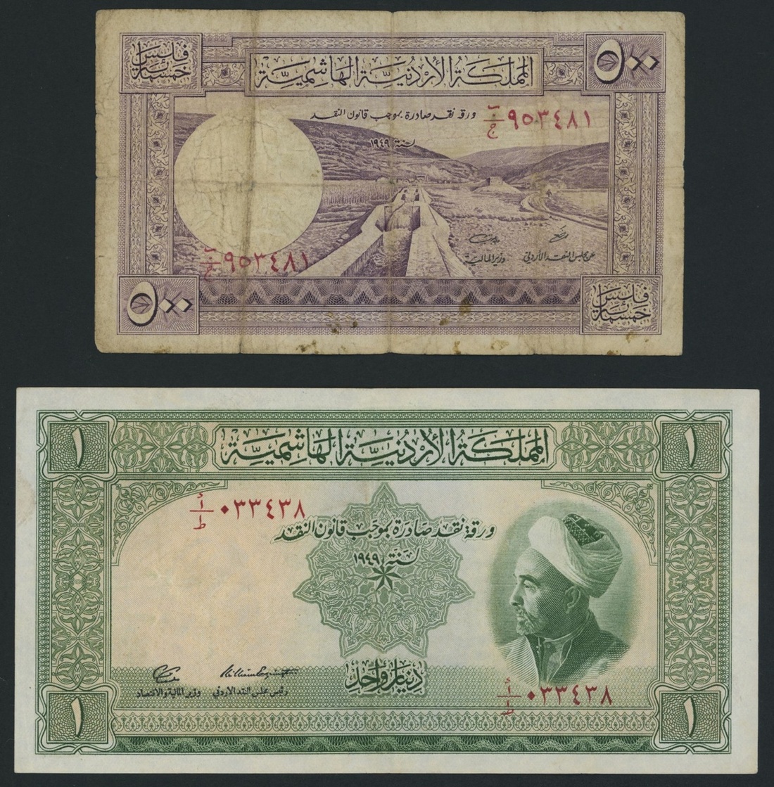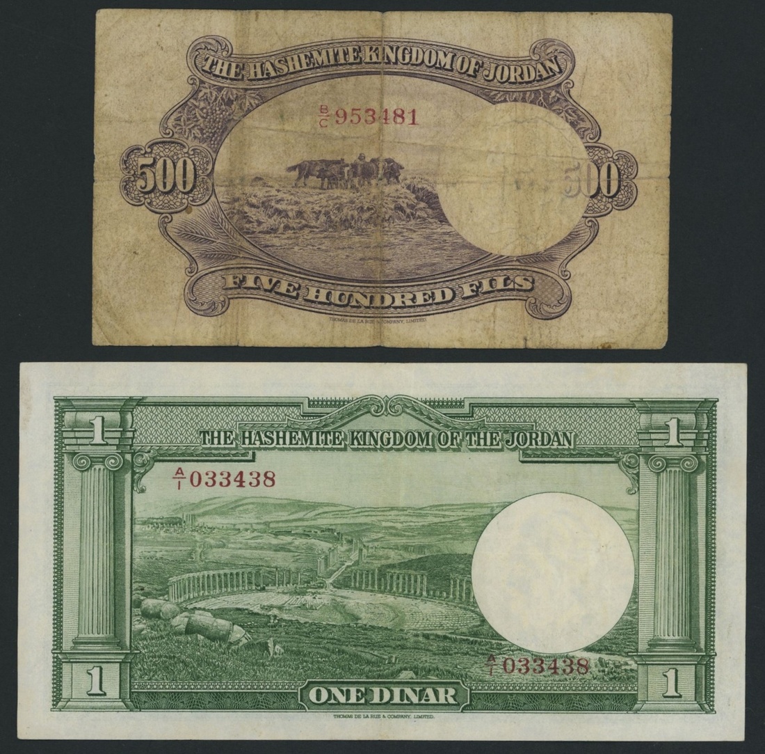 (x) Hashemite Kingdom of Jordan, [2 notes] 500 Fils, 1 Dinar, 1949-52, serial numbers, B/C 953481, A/1 033438, (Pick 5Ac, 2b), about fine and good very fine [2 notes]