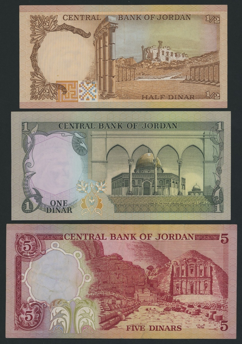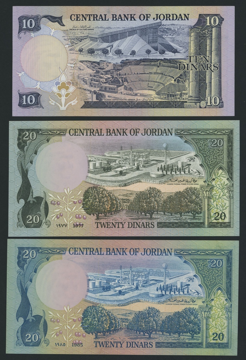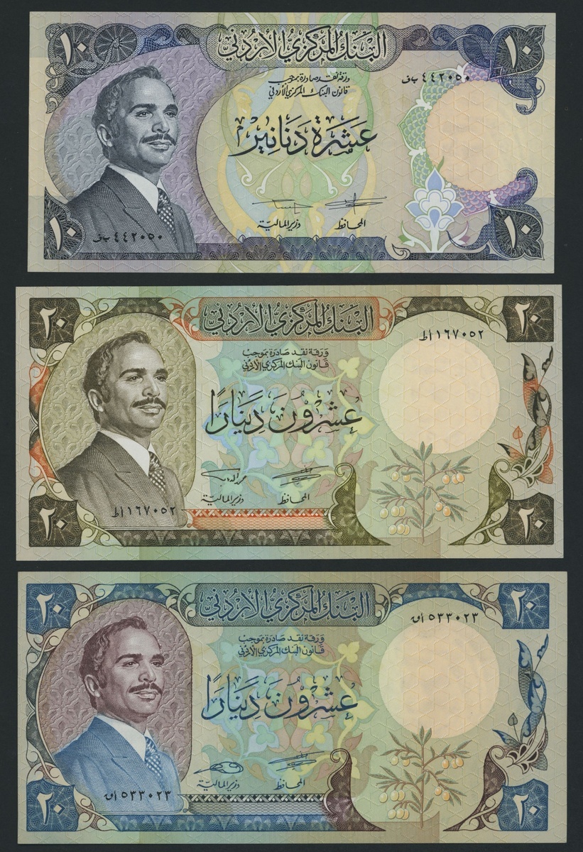 (x) Central Bank of Jordan, [6 notes] 1/2, 1, 5, 10, 20 Dinars, ND (1975-92), (Pick 17e, 18e, 19c, 20d, 21a, 22c), good very fine to about uncirculated [6 notes]