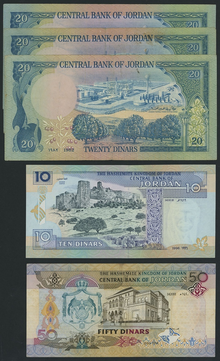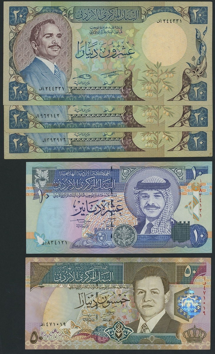 (x) Central Bank of Jordan, [5 notes] 10, 20 & 50 Dinars, 1991-99, (Pick 22b, 22c, 26a, 33a), from very fine to about uncirculated
